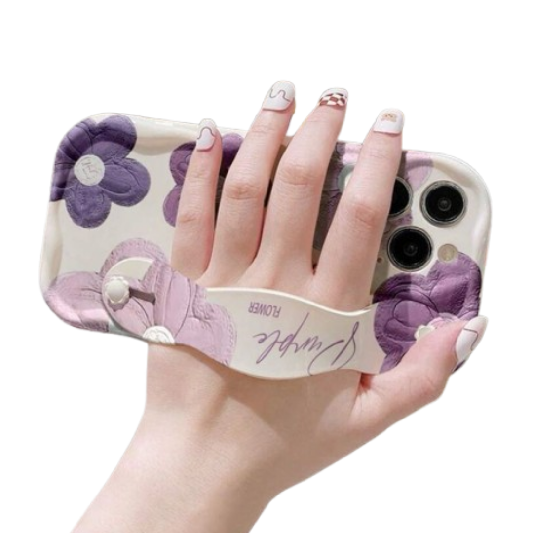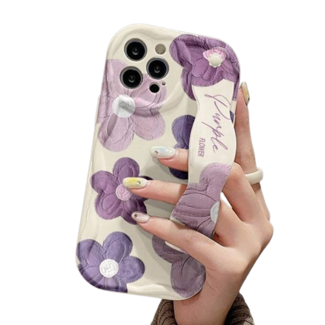 Case Antishock con diseño floreado lila, soporte de agarre y bordes gruesos ondulados (Protección Anti Caída).