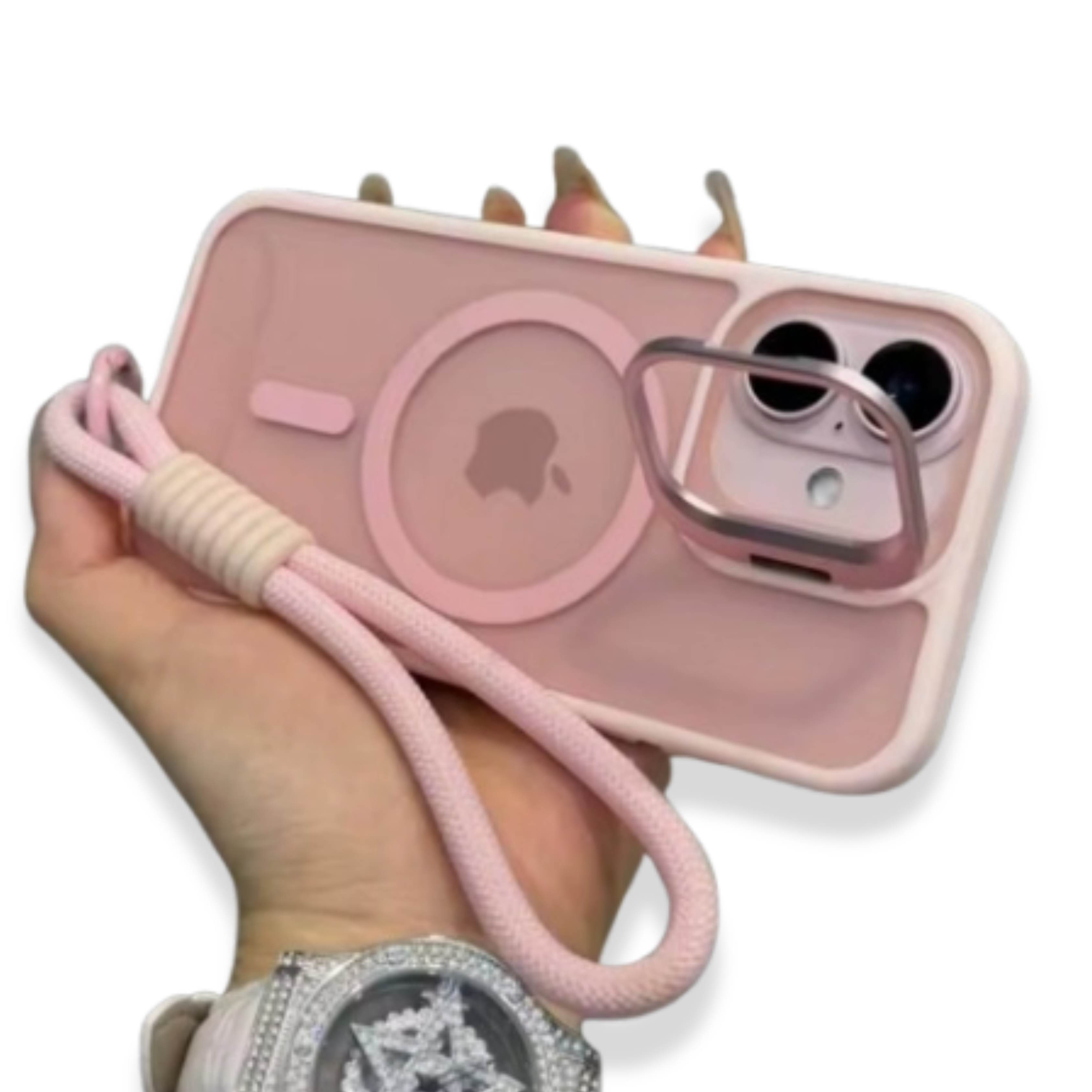 CASE ANTISHOCK MAGSAFE COLOR ROSADO CON DISEÑO MATE, BORDES REFORZADOS ANTI CAIDA, Y ARO MAGENTICO COMPATIBLE CON CARGA INALAMBRICA. MODELO CON BORDE DESLIZABLE TIPO SOPORTE. INCLUYE STRAP O CORREA GRUESA COMBINABLE. COMPATIBLE CON MODELOS IPHONE. MODELO PREMIUM ANTISHOCK PARA PROTECCIÓN ANTI CAIDA. ABSORCIÓN DE GOLPES.