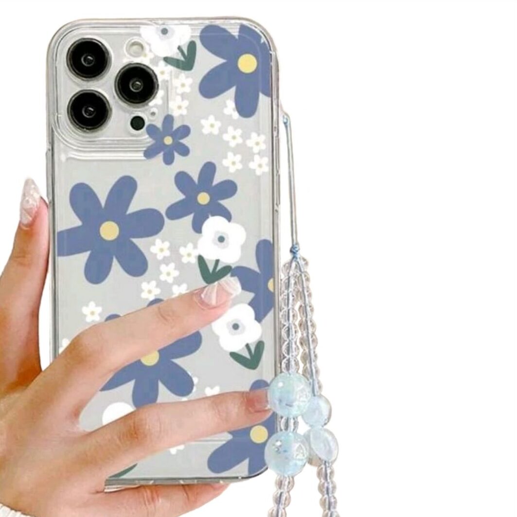CASE PARA SAMSUNG FLOREADO AZUL CON FONDO TRANSPARENTE, Y STRAP ESTILO PULSERA COLOR CELESTE. COMPATIBLE CON MODELOS SAMSUNG.