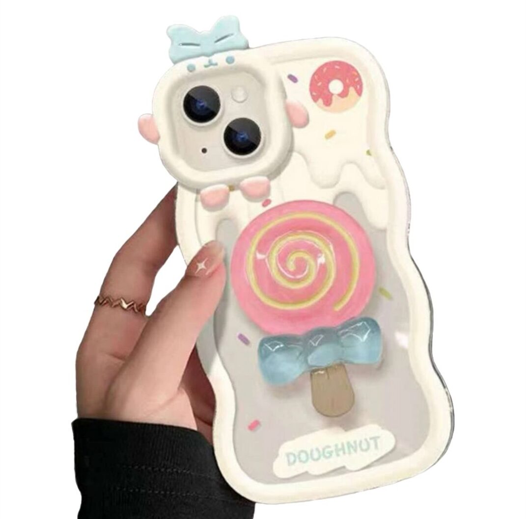 CASE PARA IPHONE ANTISHOCK TRANSPARENTE CON BORDES BLANCOS ONDULADOS Y REFORZADOS, Y DISEÑO DE DULCES CON POP SOCKET.