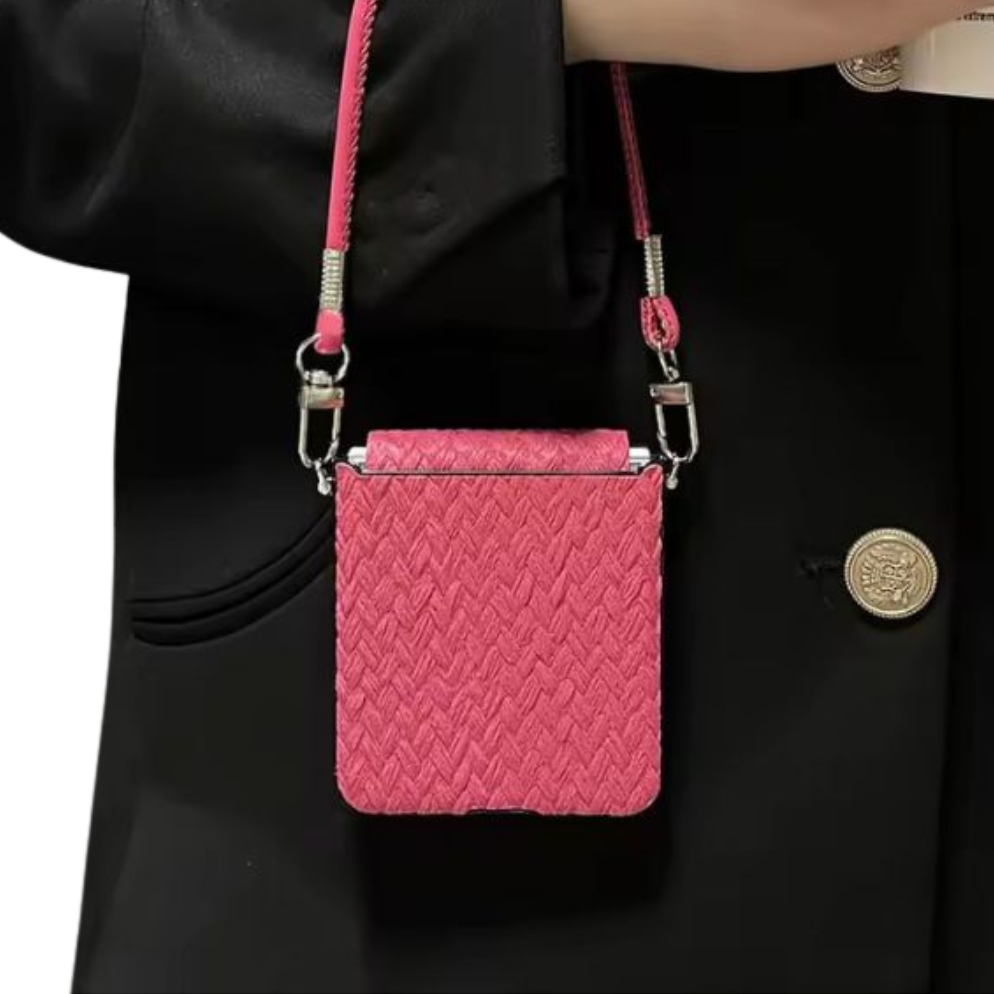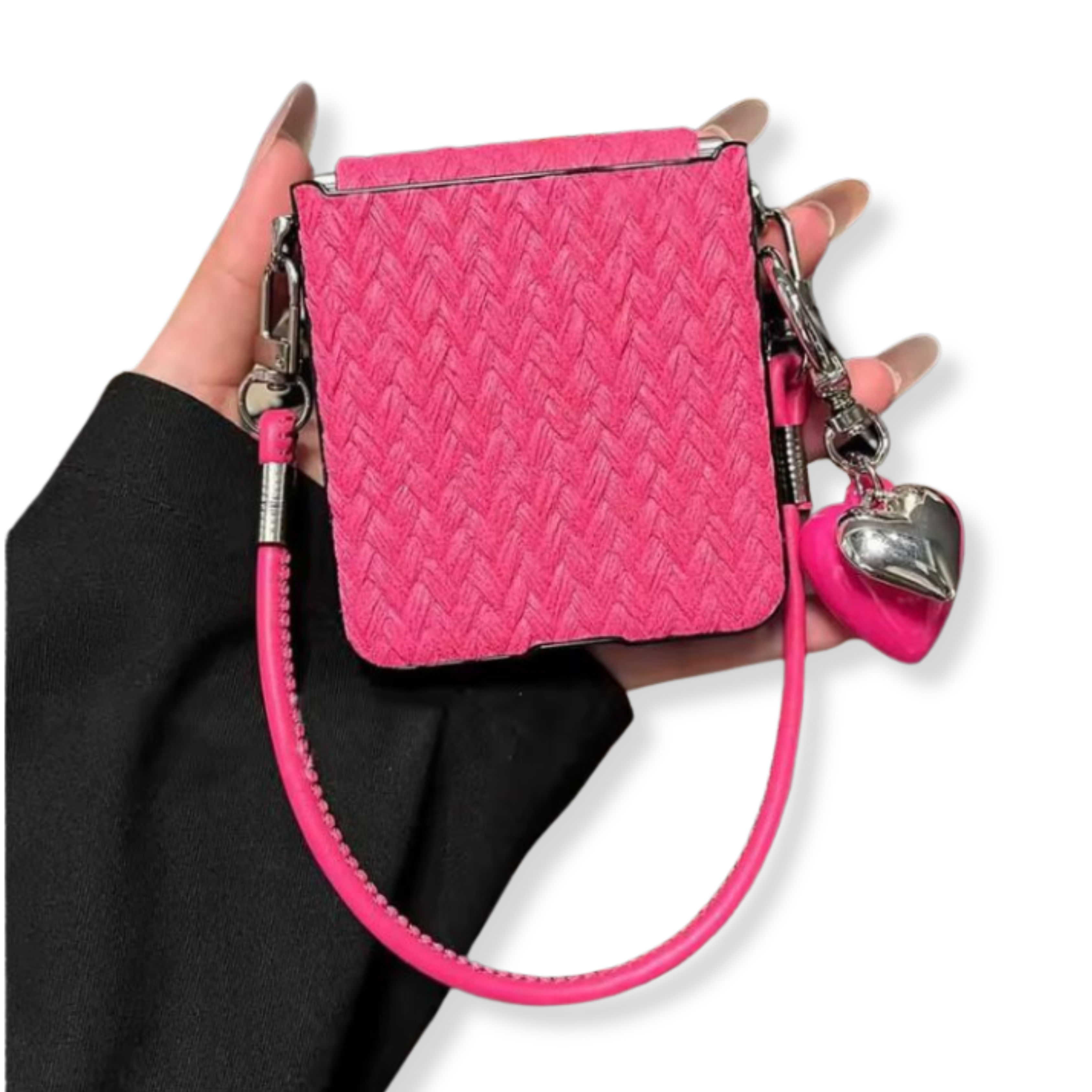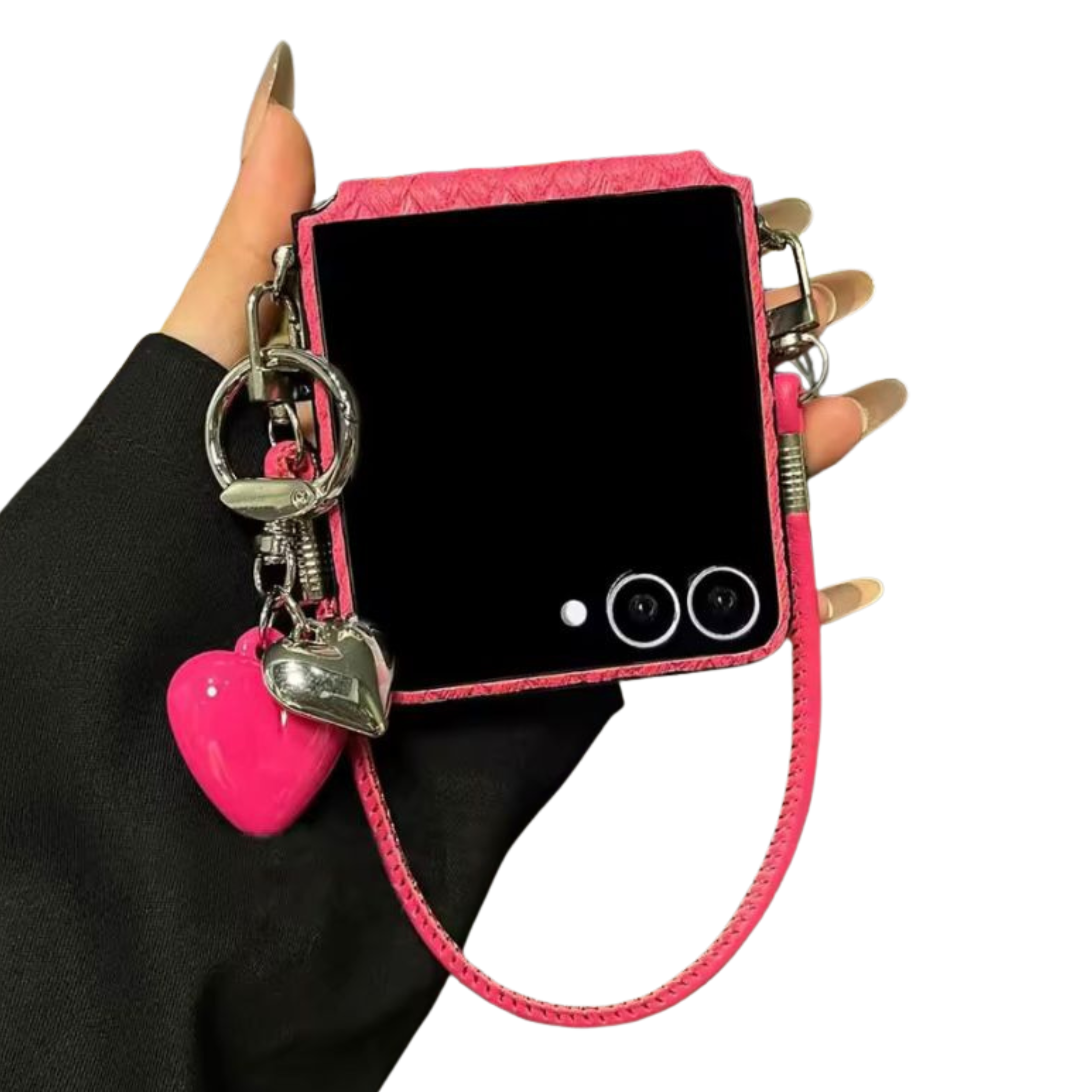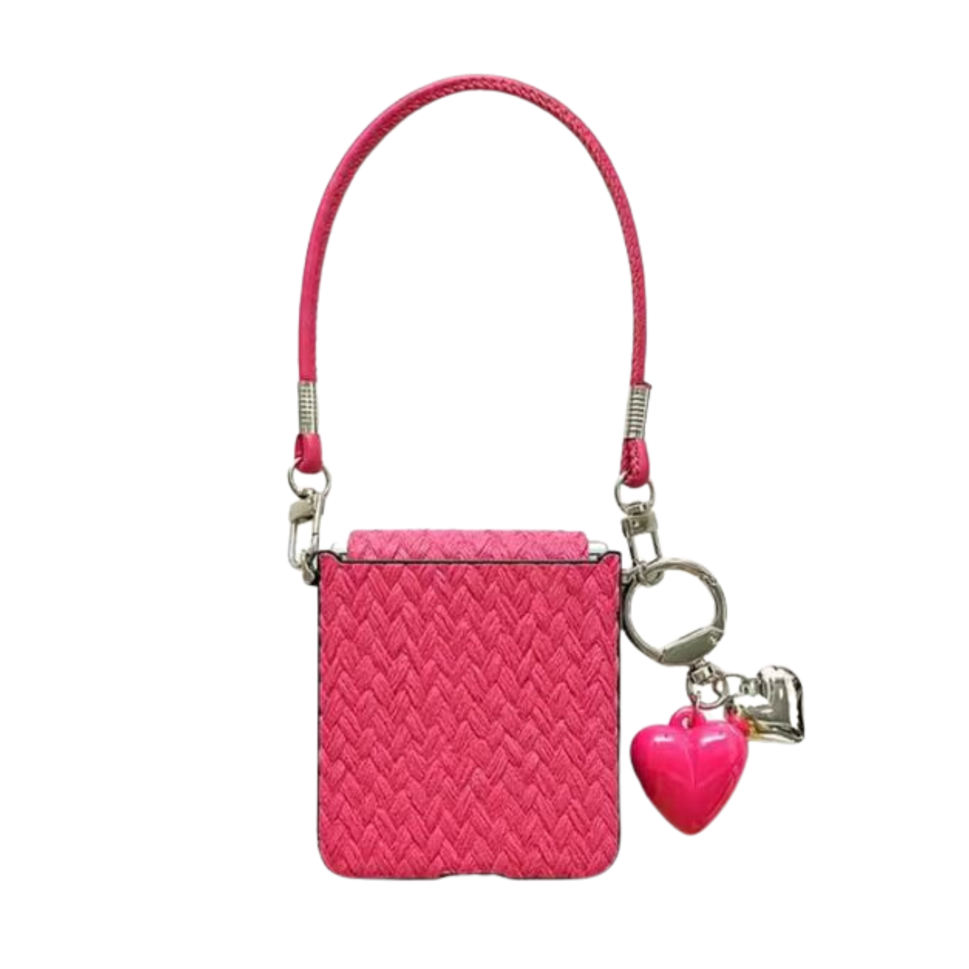 CASE FLIP ANTISHOCK COLOR ROSADO CON COLGANTE. MODELO CON TEXTURA Y PROTECCIÓN DE LOMO. INCLUYE ADORNOS DE CORAZONES ROSADO Y PLATEADO.