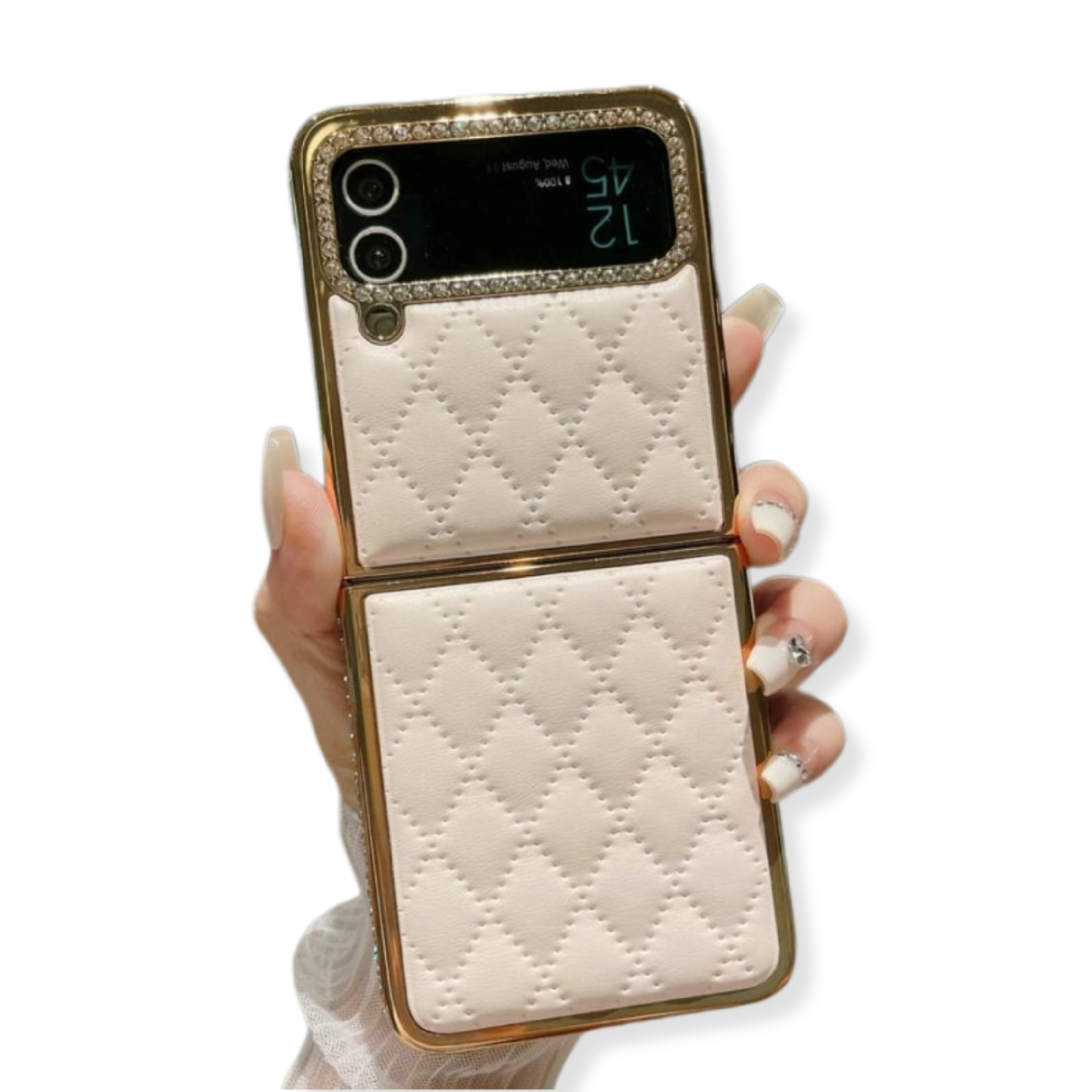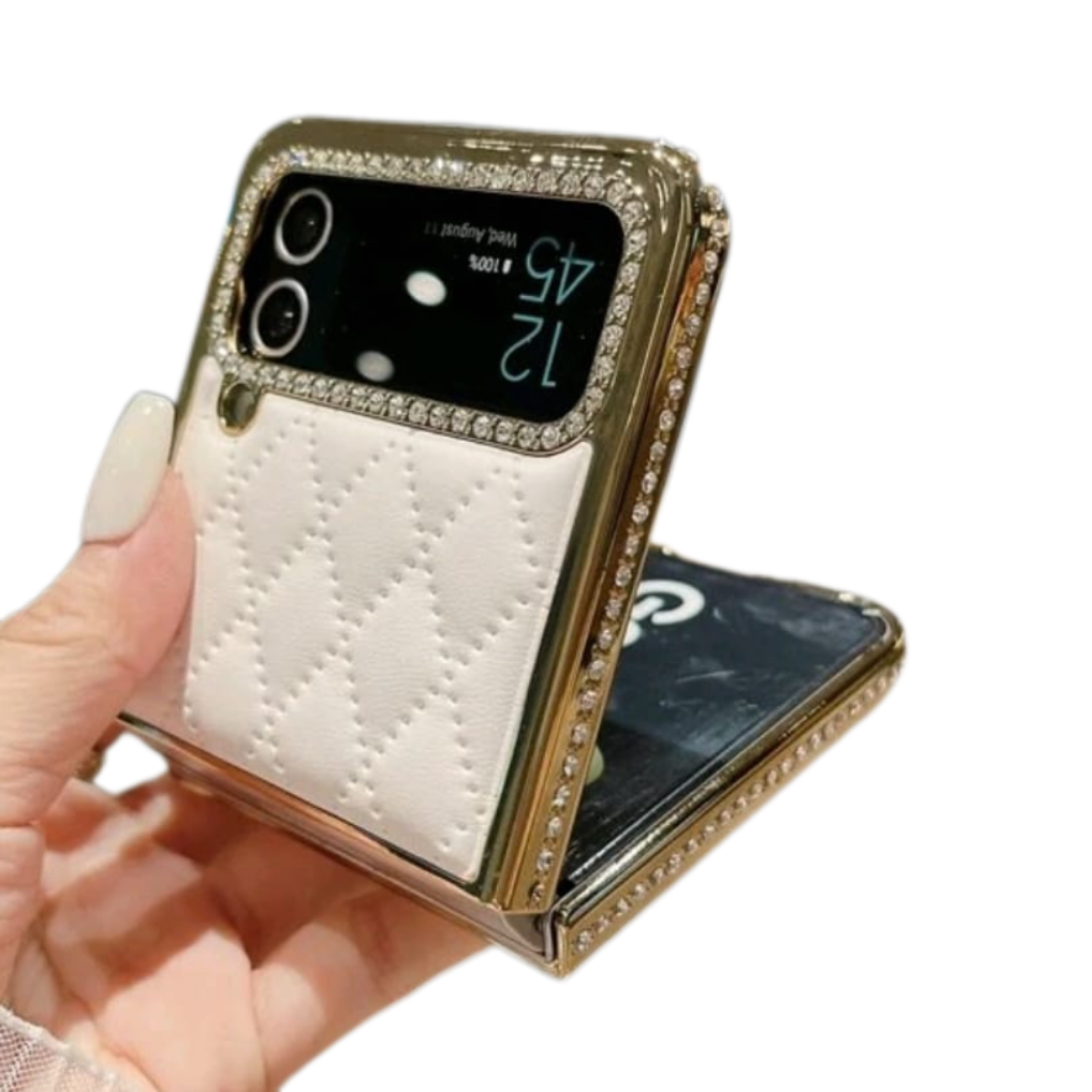 CASE FLIP BLANCO ACOLCHADO DE CUERO CON BORDES DORADOS Y ADORNOS DE PIEDRERÍA BRILLANTES. COMPATIBLE CON MODELOS GALAXY Z FLIP.