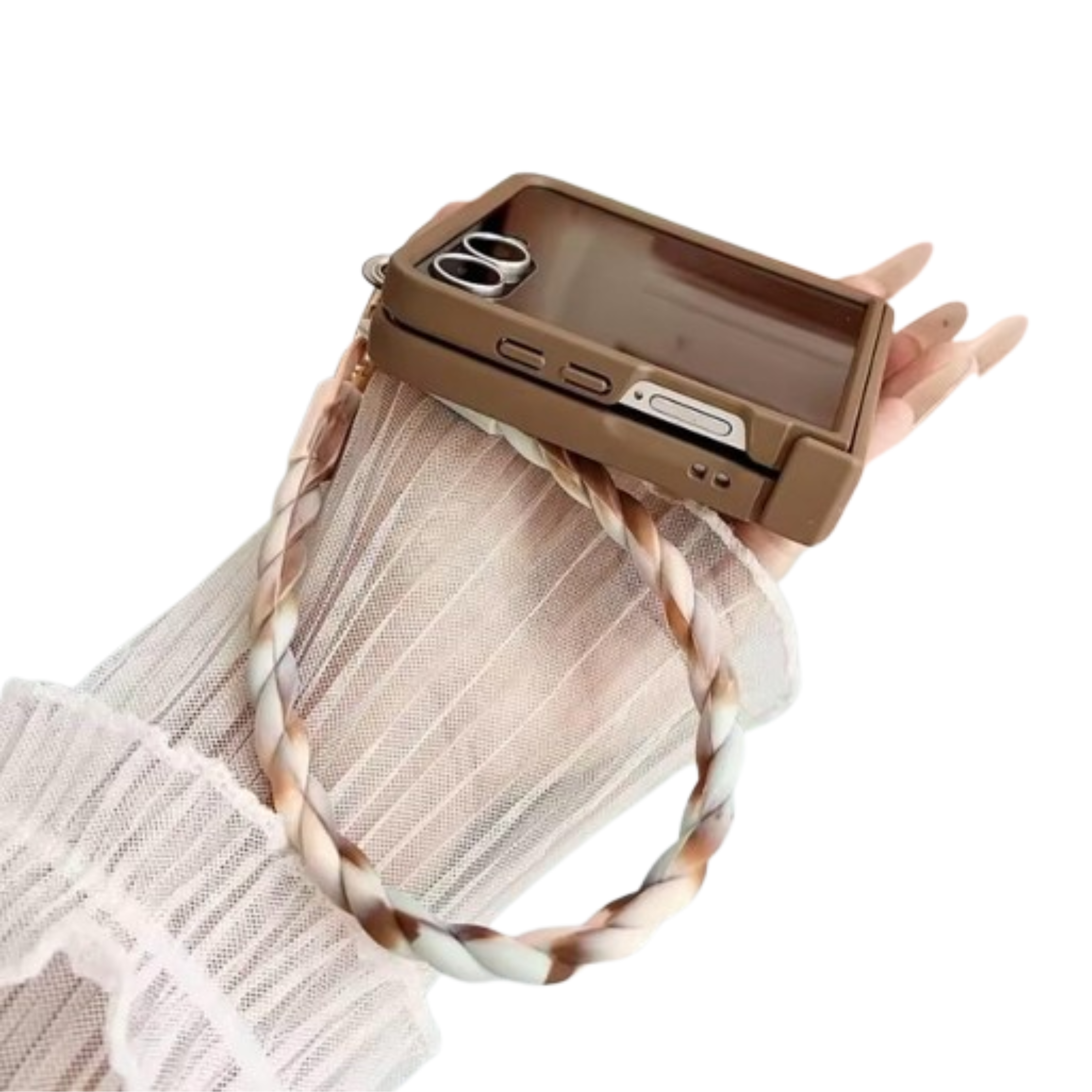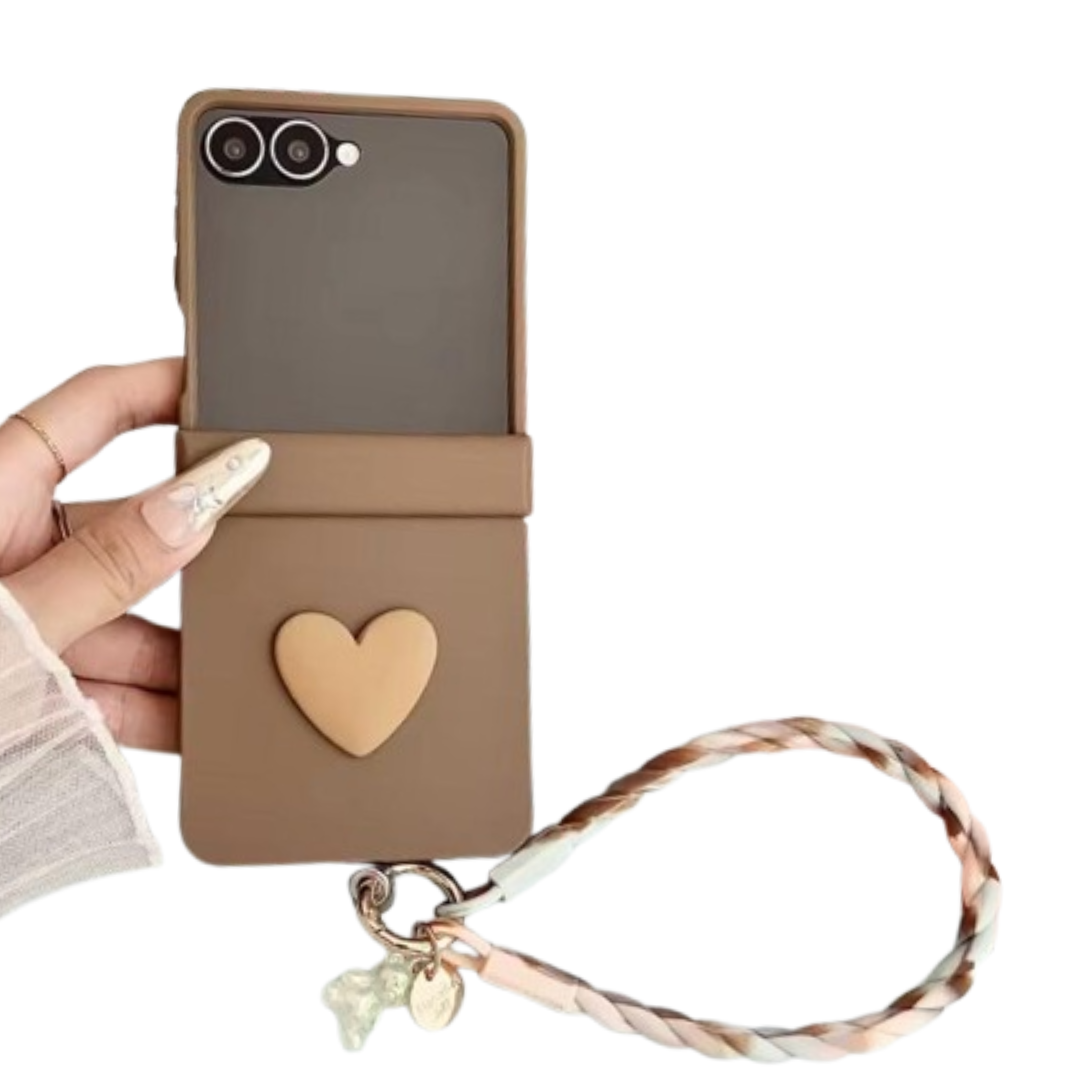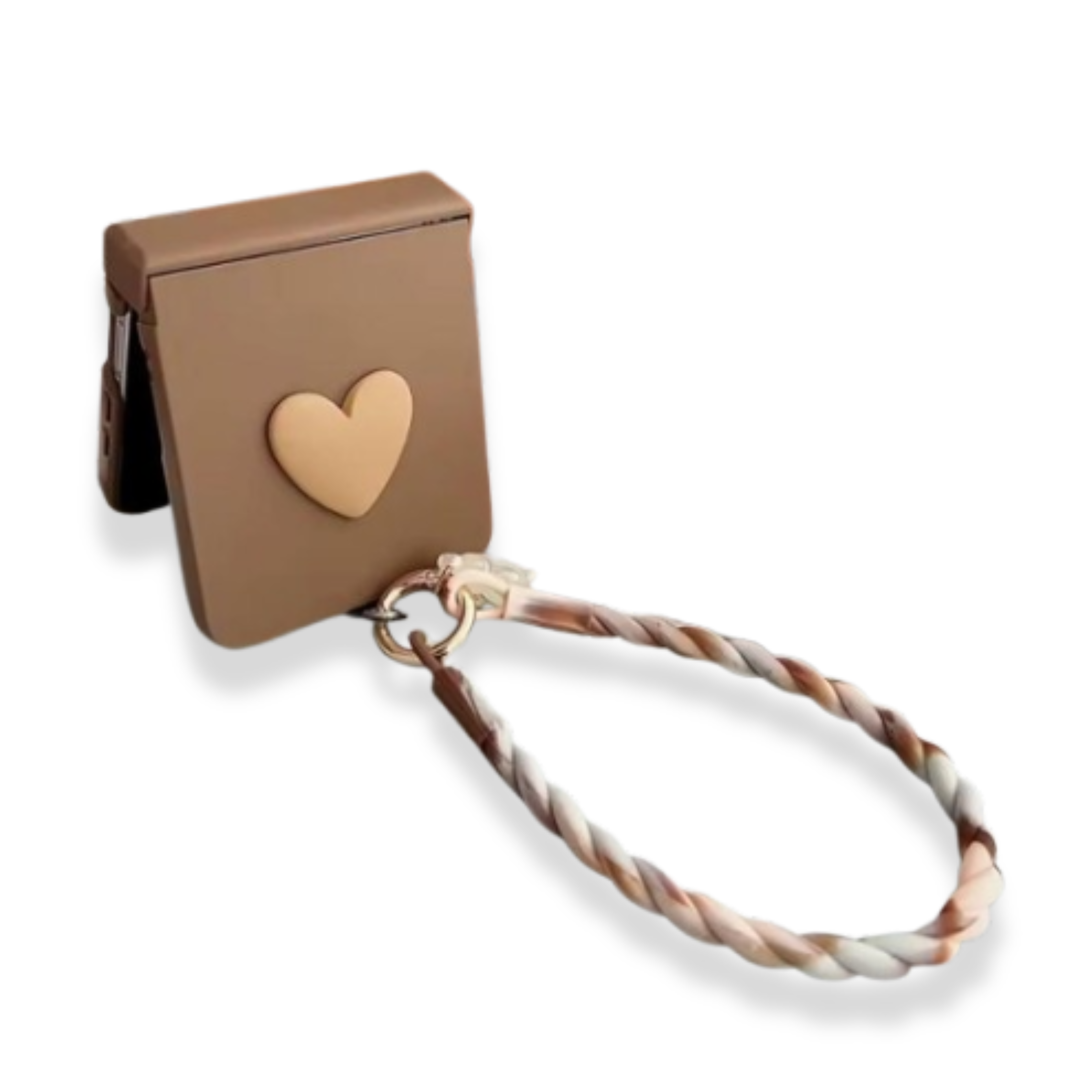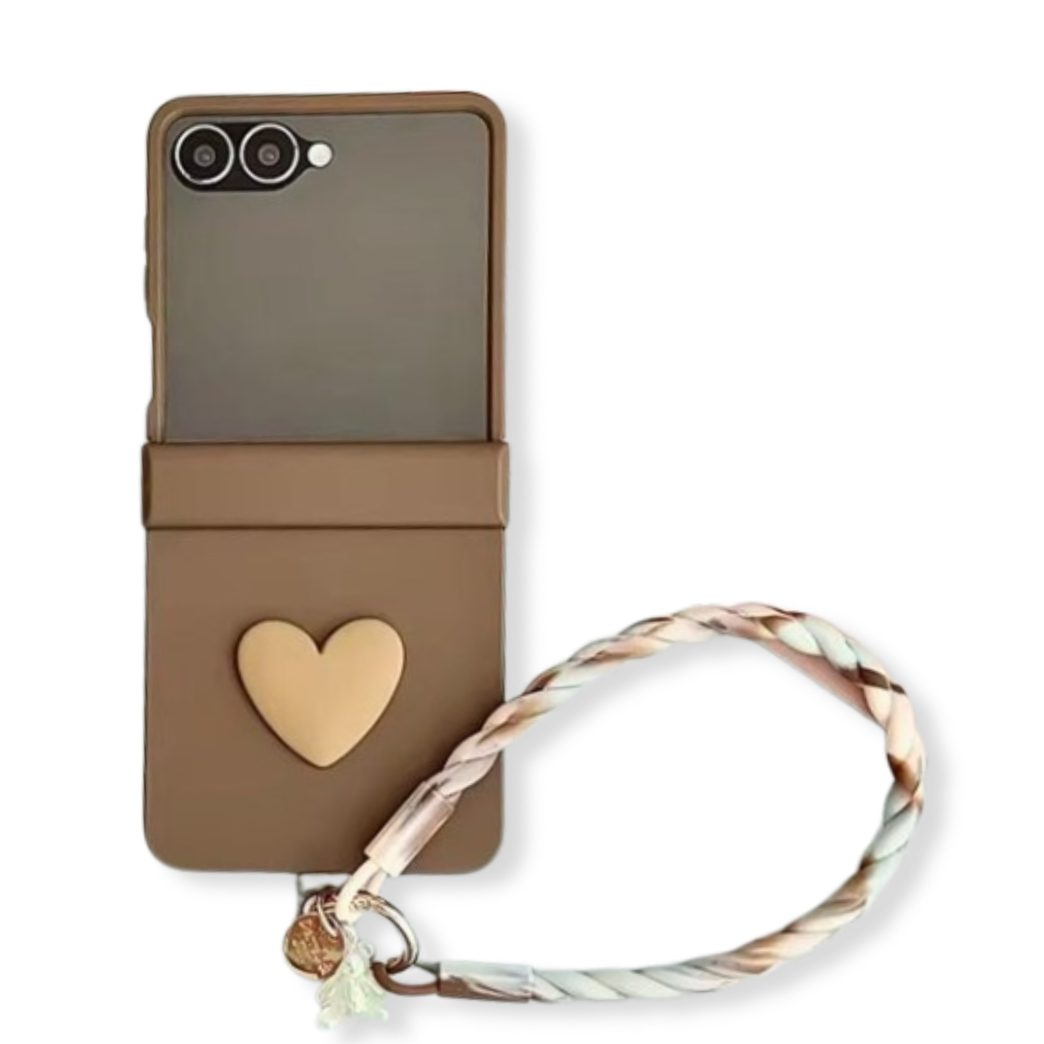 CASE FLIP CON STRAP MARRÓN Y DISEÑO DE CORAZÓN EN ALTO RELIEVE. MODELO PREMIUM DE TPU CON ESTRUCTURA RÍGIDA Y PROTECTOR DE LOMO. EL CASE INCLUYE EL PROTECTOR DE LA PANTALLA POSTERIOR. INCLUYE STRAP PREMIUM CON ADORNOS Y ACCESORIOS. COMPATIBLE CON MODELOS GALAXY Z FLIP SERIES.
