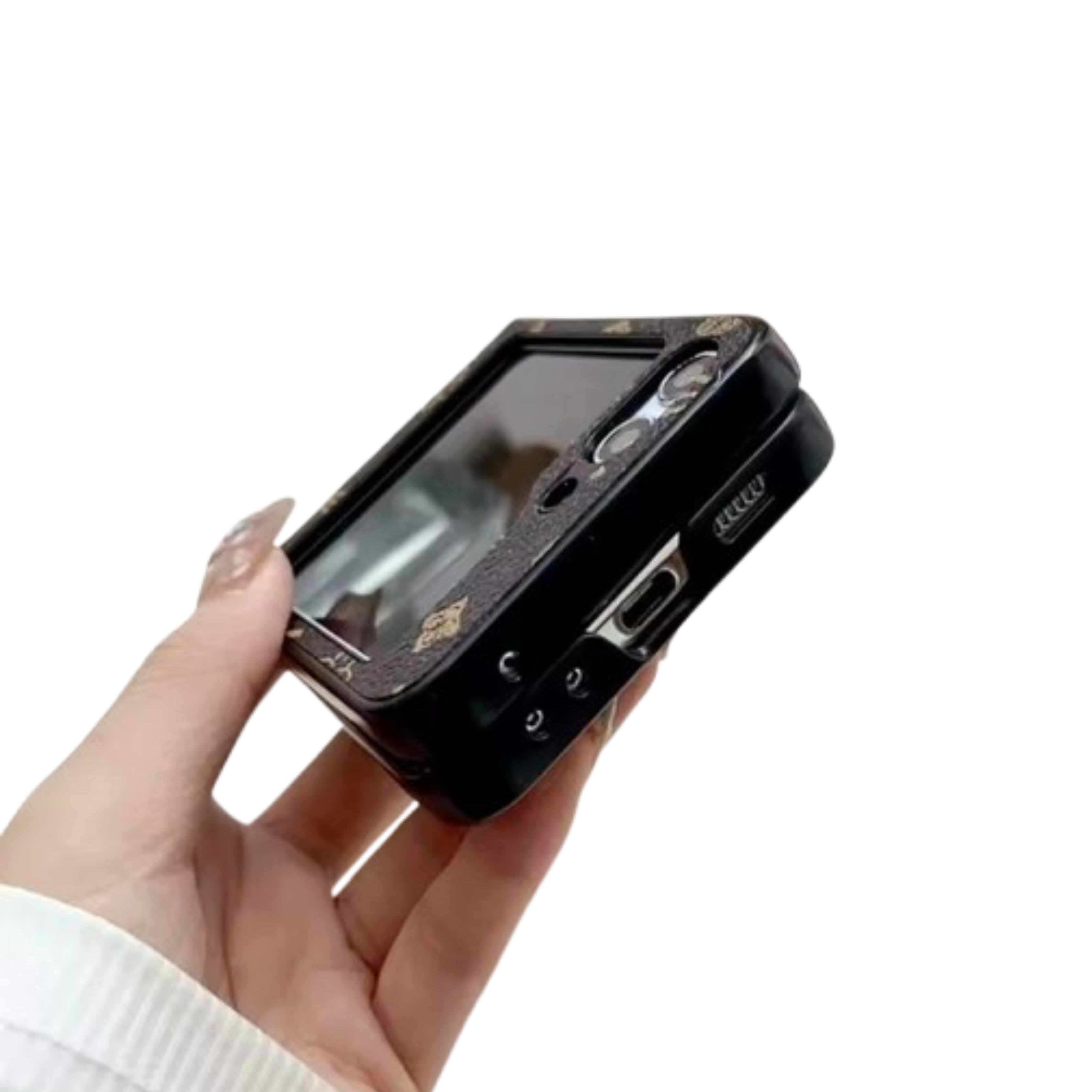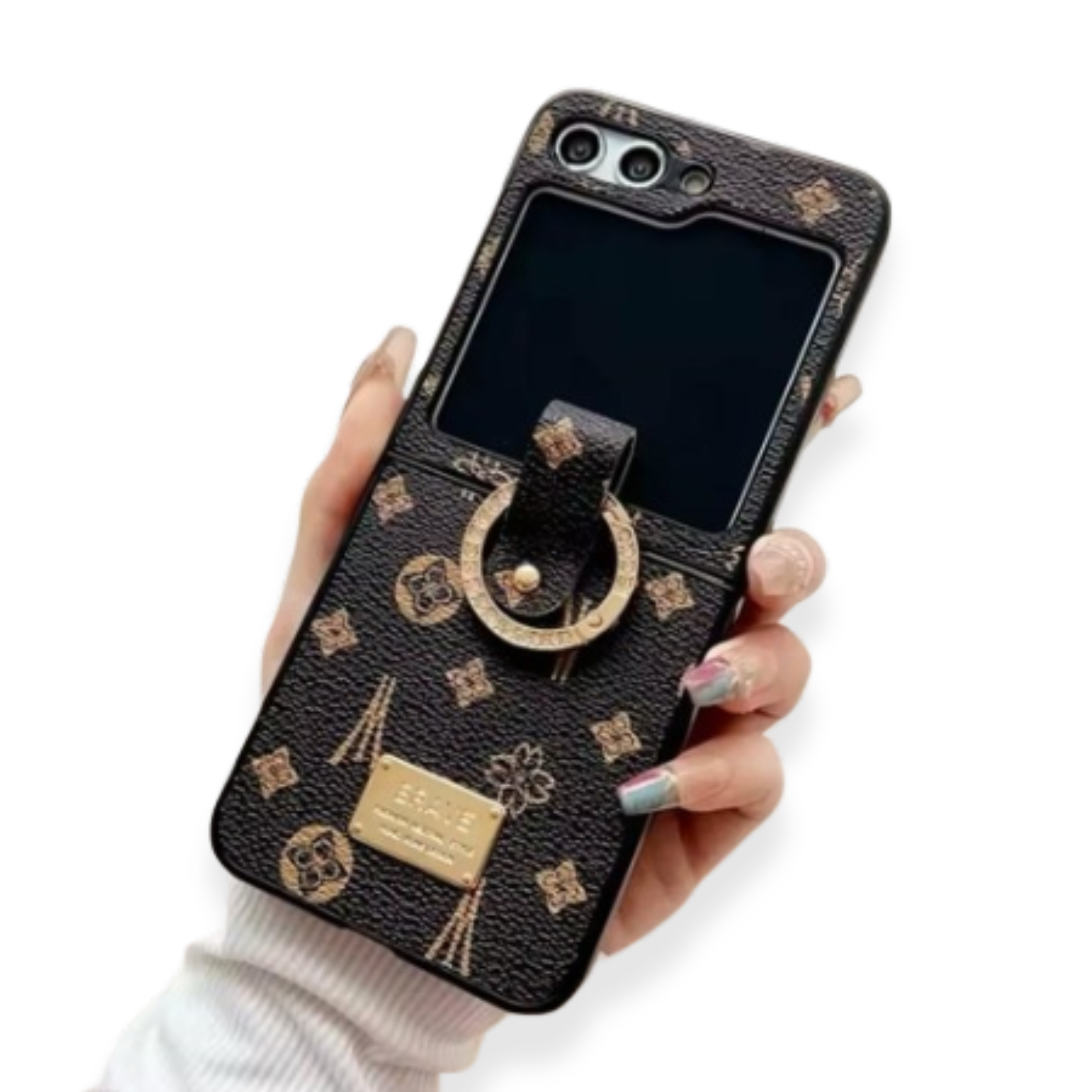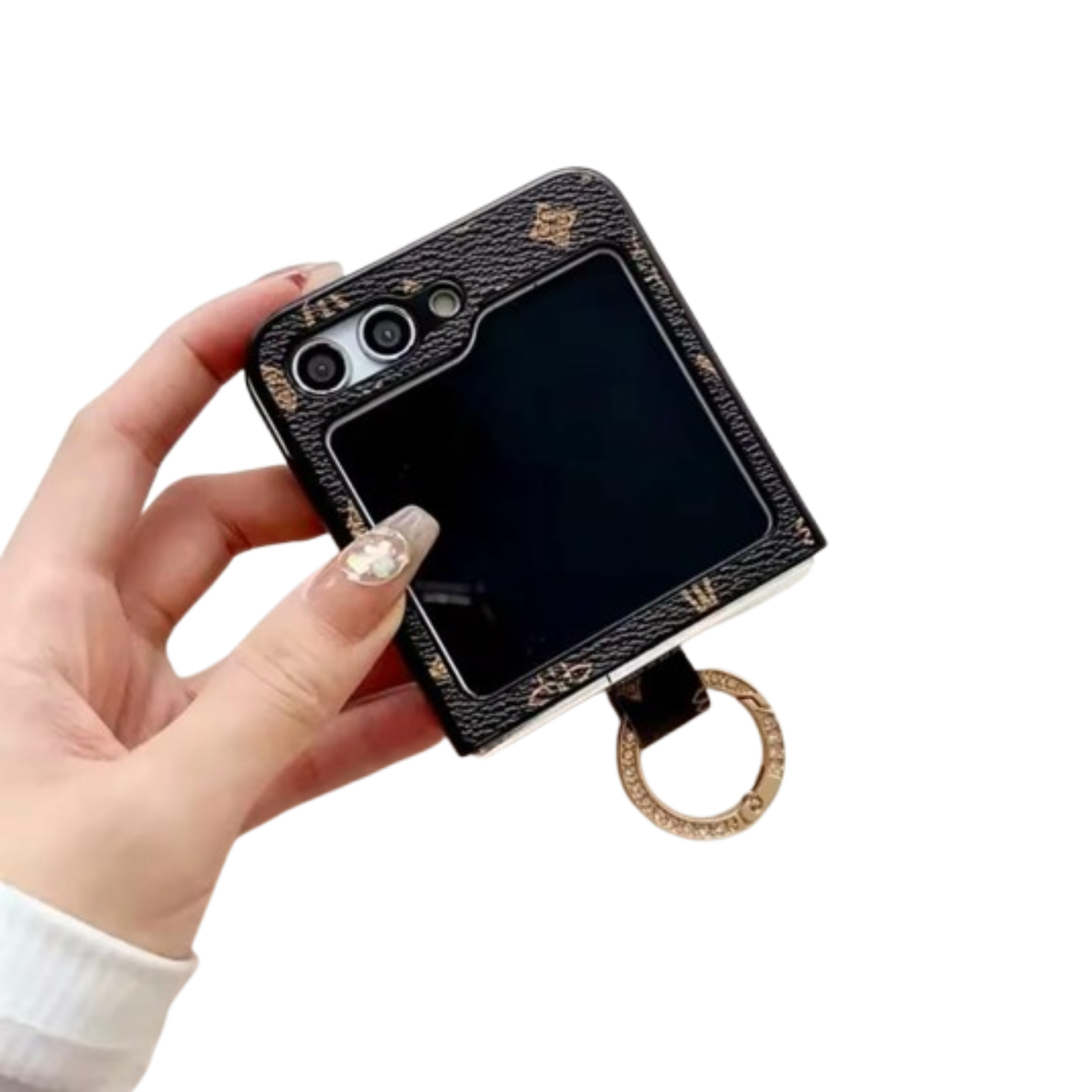 CASE FLIP DISEÑO ELEGANTE Y ANILLO DORADO CON PEDRERÍA DE ADORNO (TIPO LLAVERO). MODELO DE TEXTURA RUGOSA MATERIAL IMITACIÓN DE CUERO CON BORDES DE TPU COLOR NEGRO. COMPATIBLE CON MODELOS GALAXY Z FLIP.