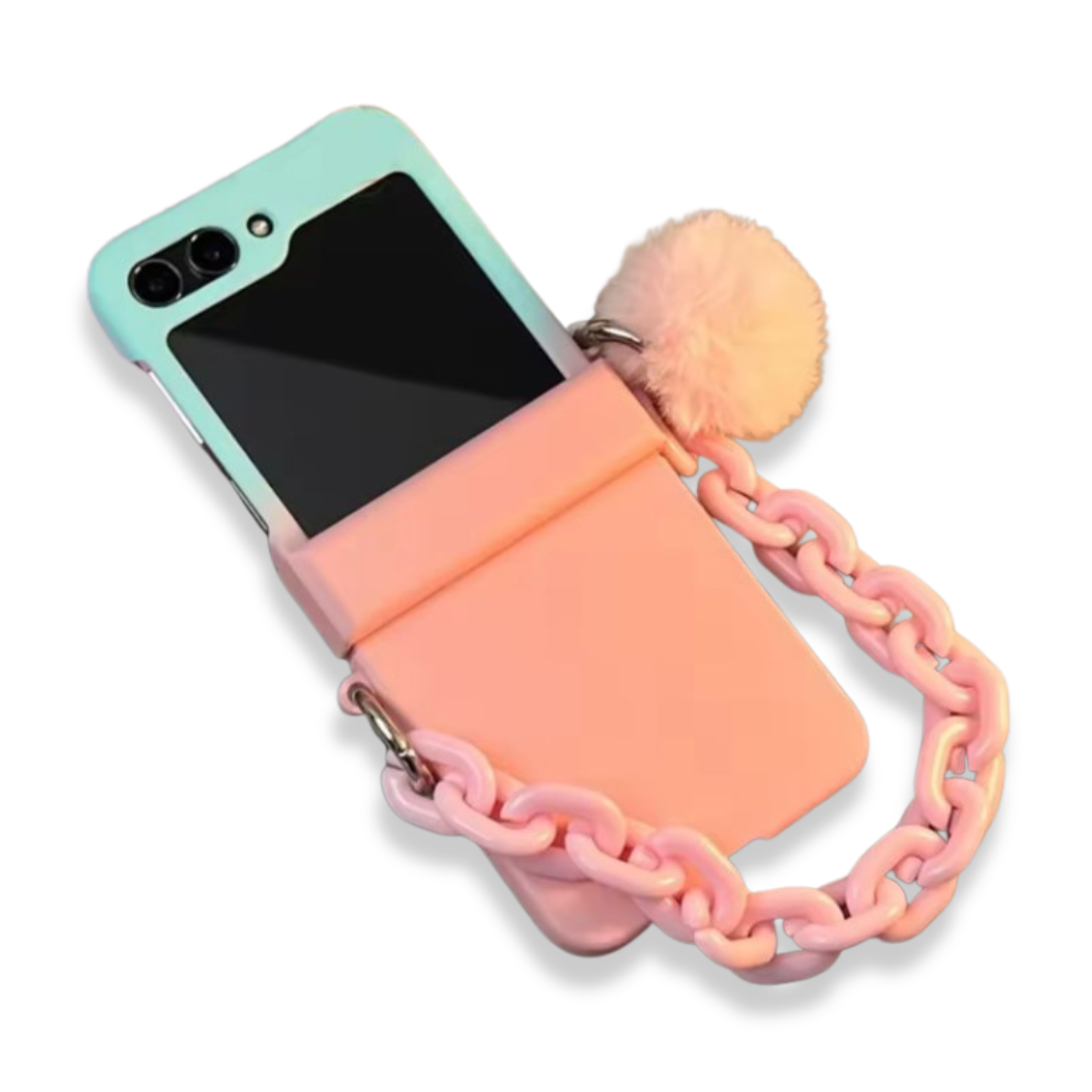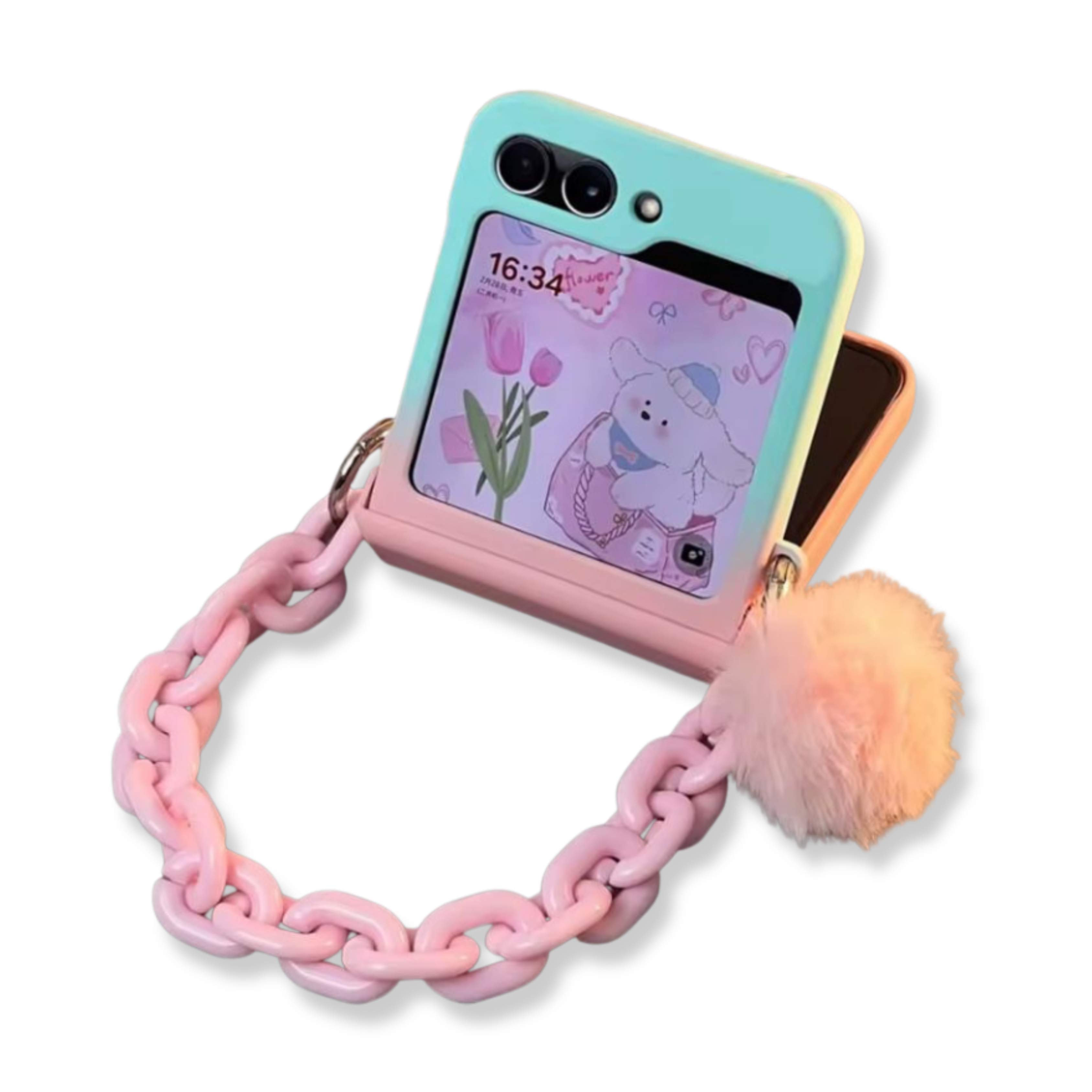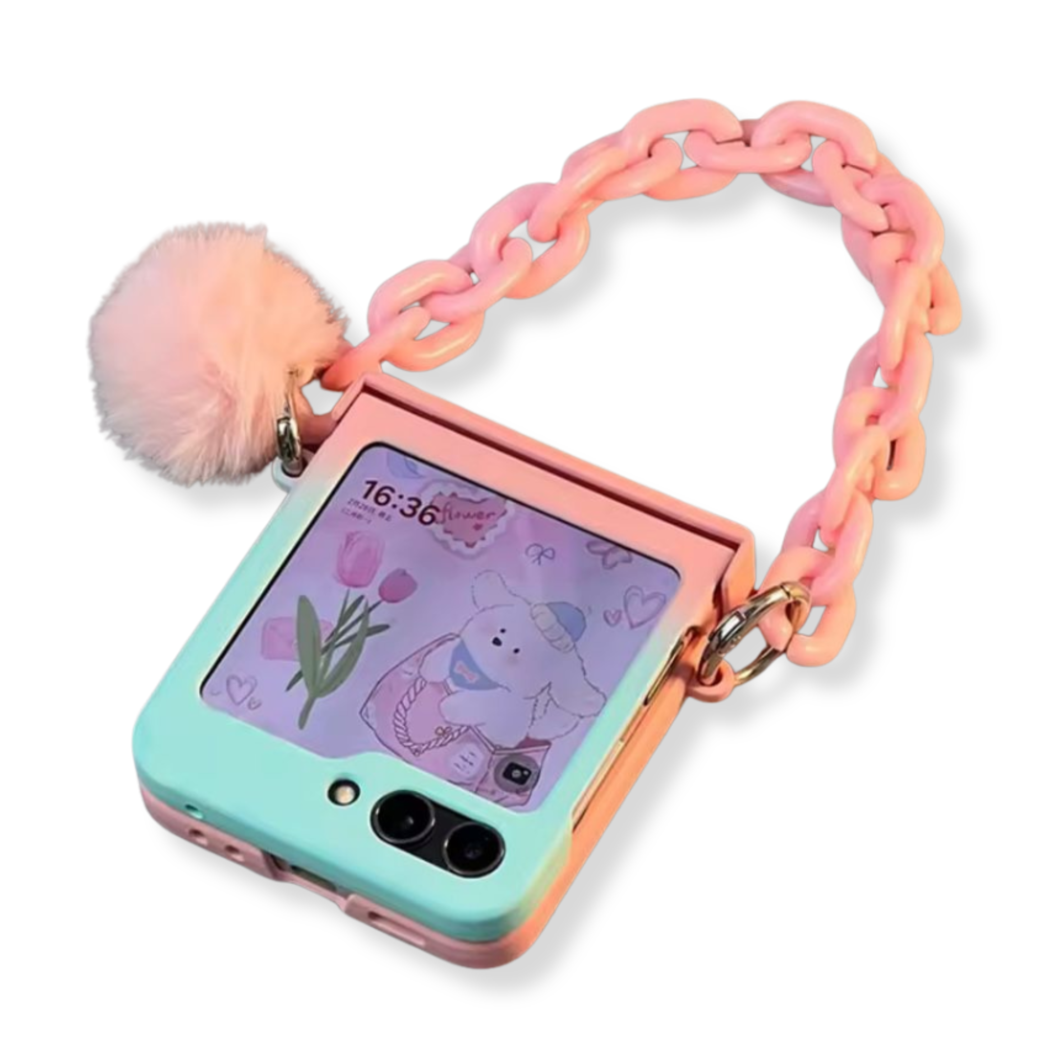 CASE FLIP PREMIUM COLOR ROSADO Y CELESTE ESTILO DEGRADADO. DISEÑO DE ESTRUCTURA RÍGIDA. MODELO CON COLGANTE Y ADORNOS ROSADOS. MODELO CON PROTECTOR DE LOMO.
