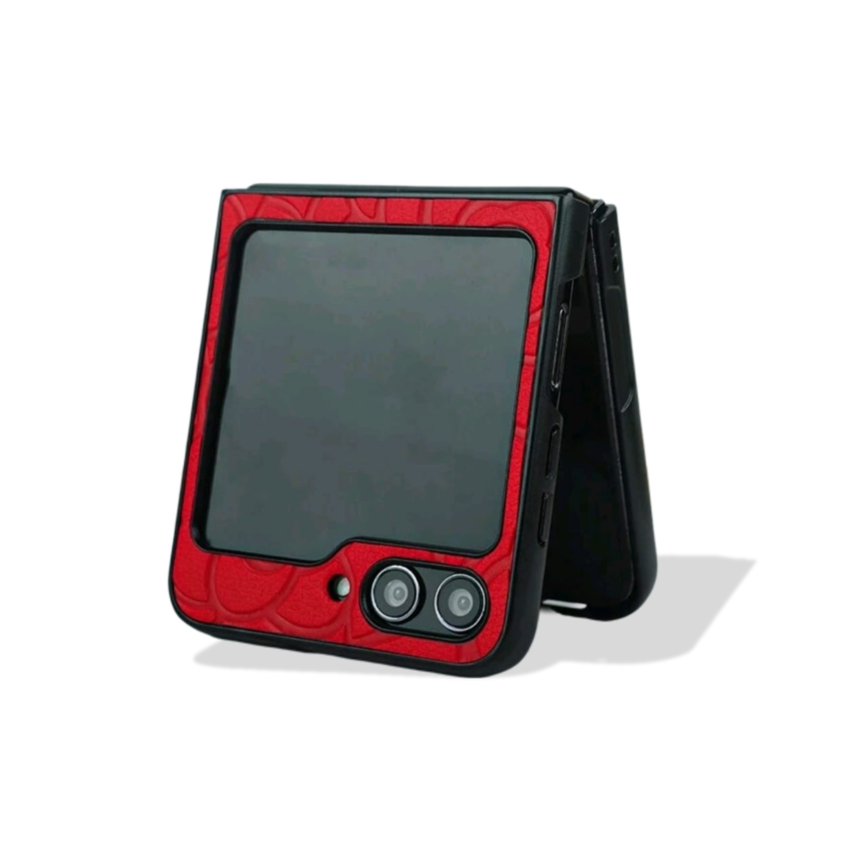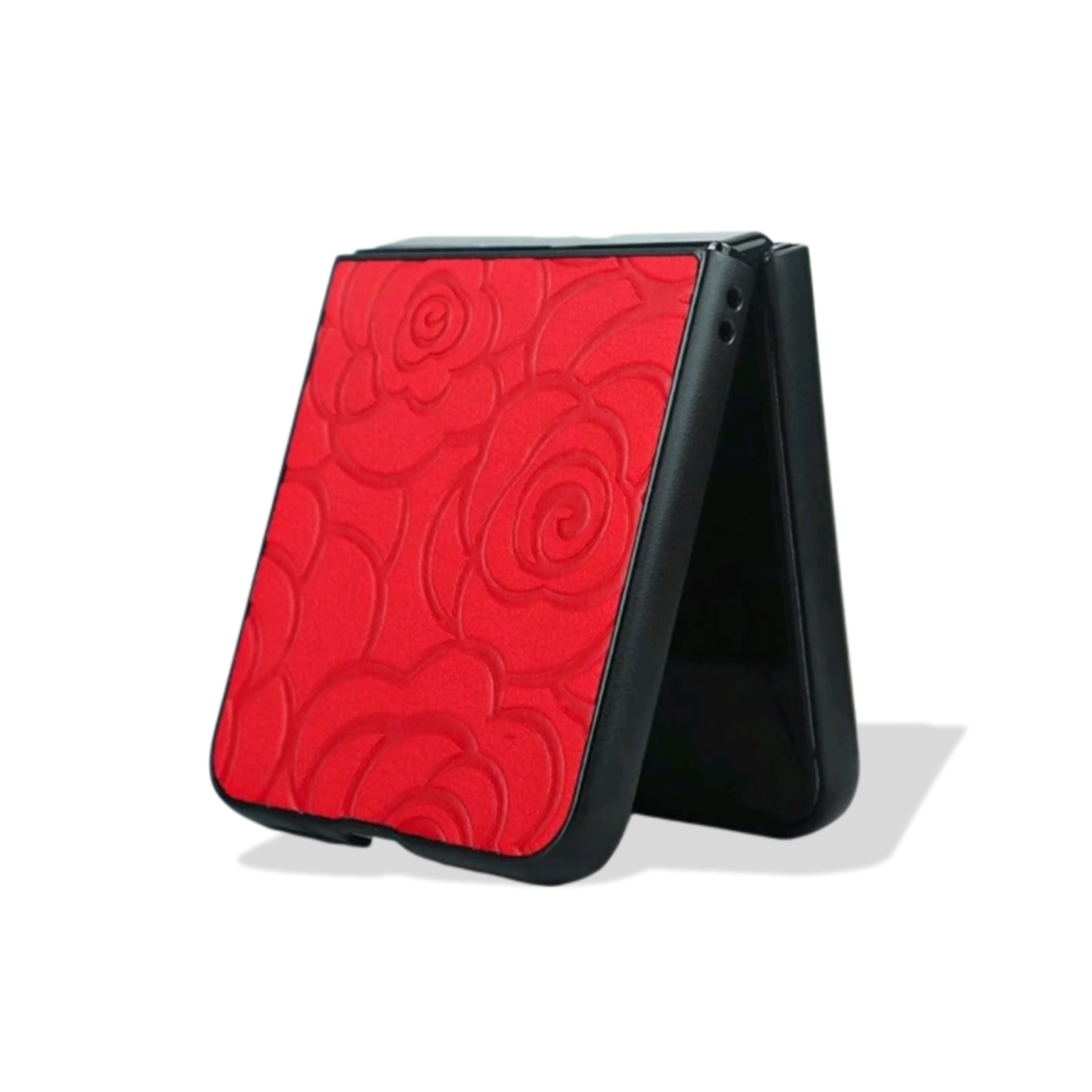 CASE FLIP ROJO CON TEXTURA Y DISEÑO FLOREADO COMPATIBLE CON MODELOS GALAXY Z FLIP SERIES.