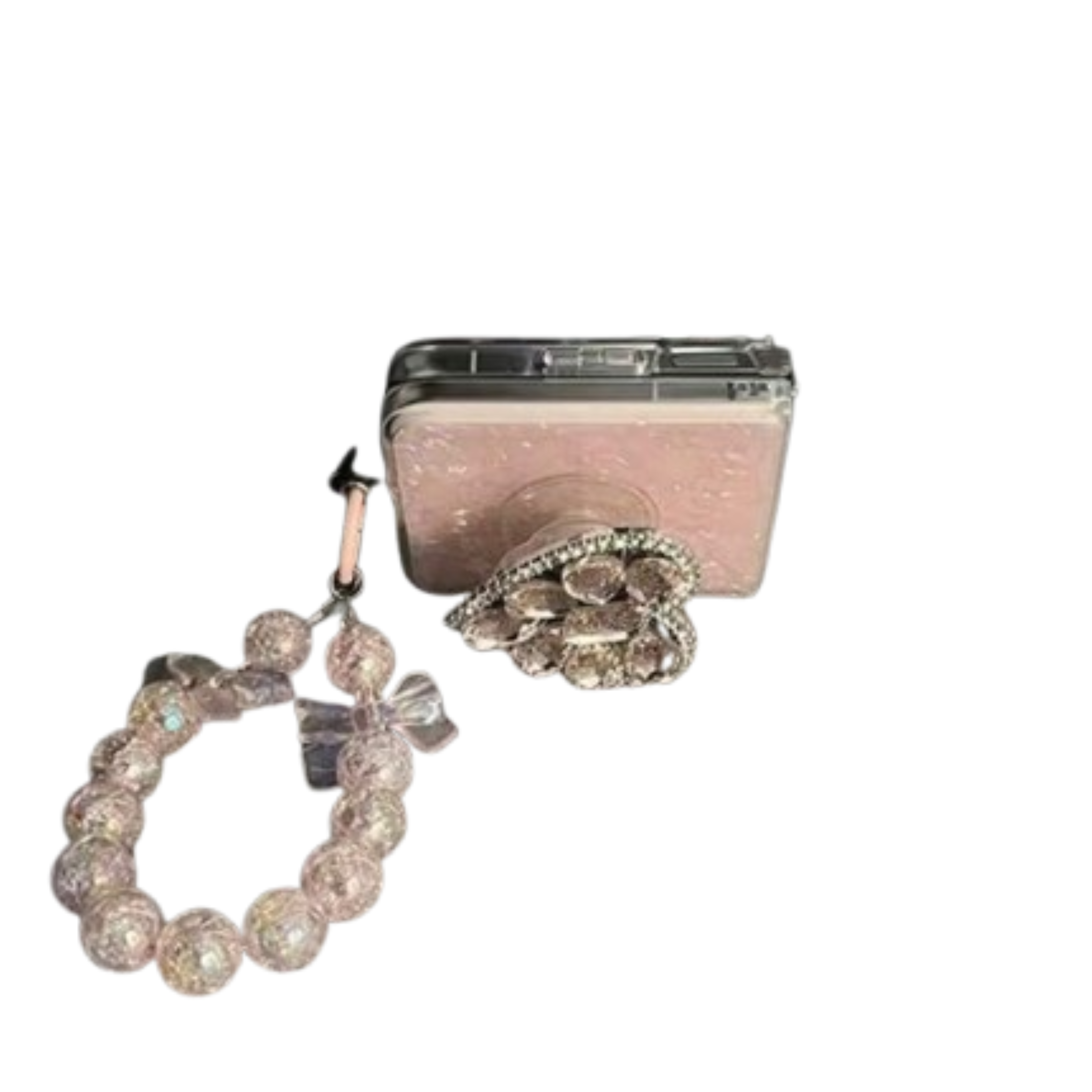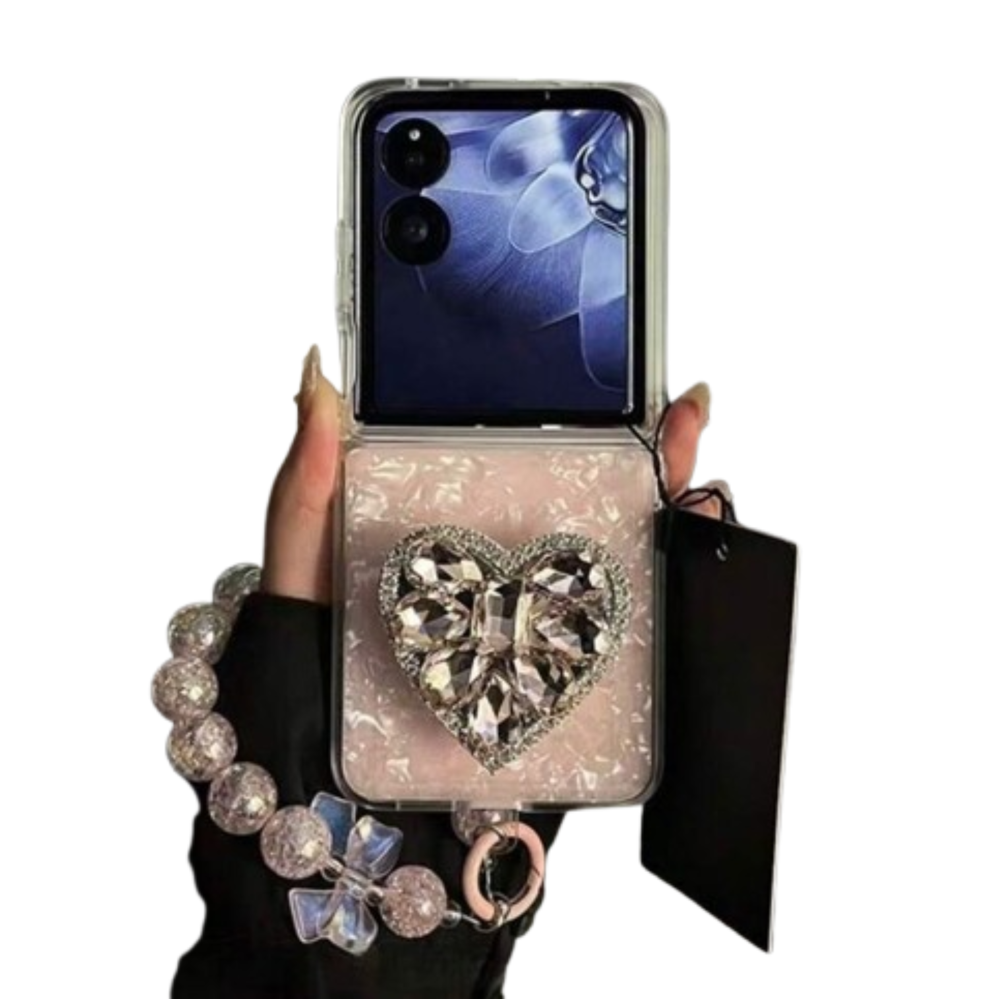 CASE FLIP ROSA PREMIUM DE MATERIAL TPU COMPATIBLE CON MODELO GALAXY Z FLIP. EL MODELO INCLUYE STRAP ROSA ESTILO PULSERA CON DISEÑO TORNASOLADO. INCLUYE POP SOCKET PREMIUM CON DISEÑO DE CORAZÓN BRILLANTE Y PEDRERÍA ROSA.