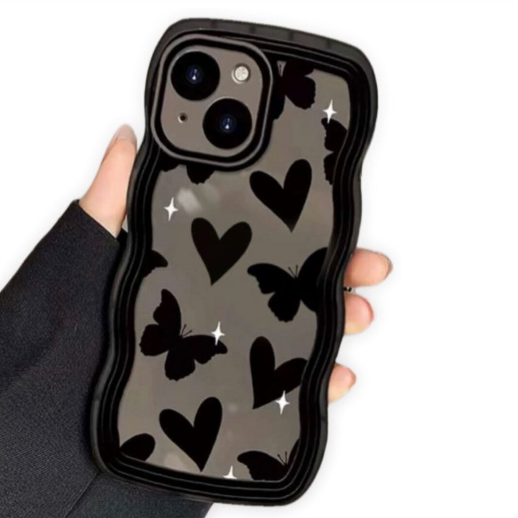 CASE ANTISHOCK COLOR NEGRO CON DISEÑO TRANSPARENTE Y BORDES NEGROS REFORZADOS. MODELO CON BORDES ONDULADOS Y CORAZONES NEGROS VARIOS. COMPATIBLE CON MODELO SAMSUNG.