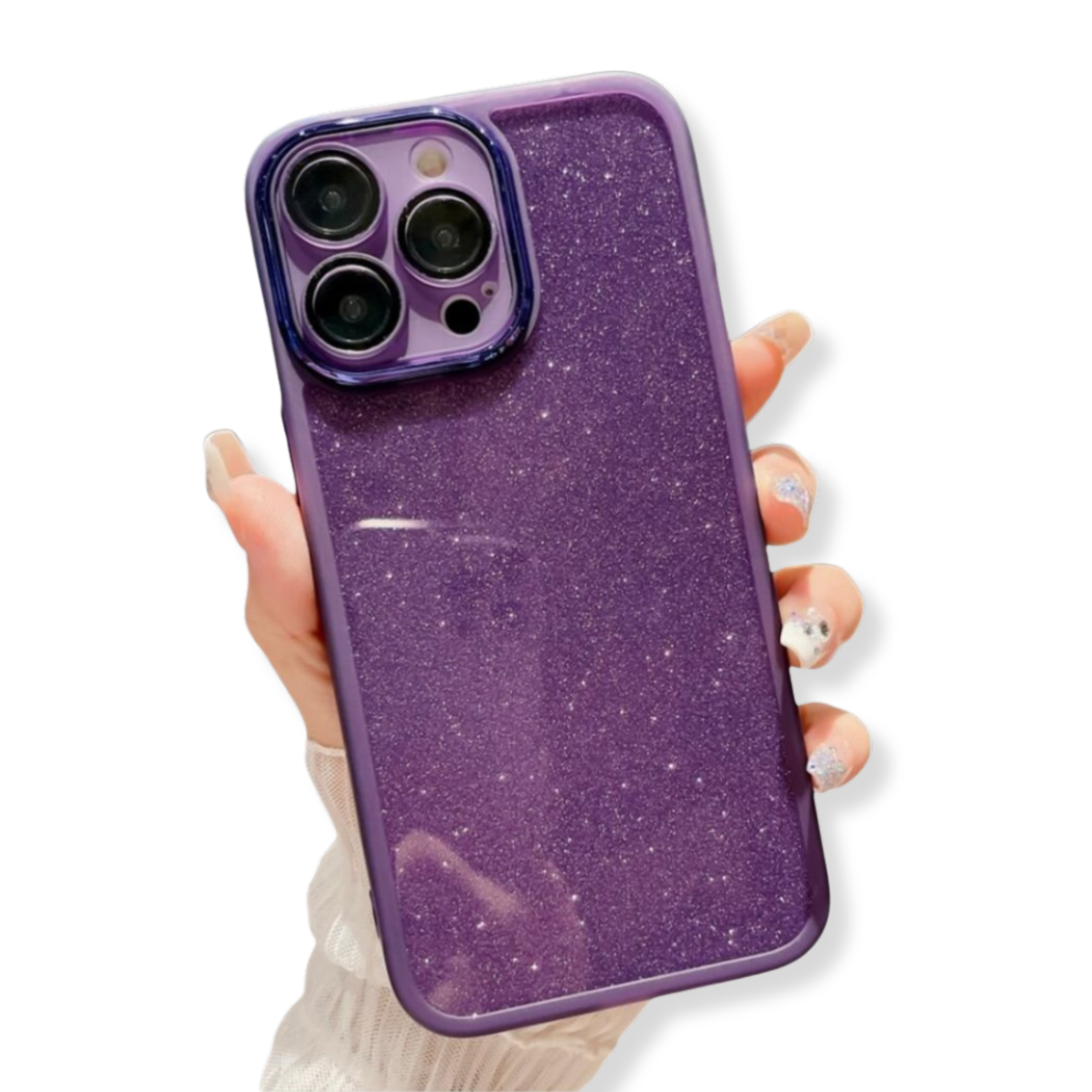 CASE MORADO BRILLANTE CON PROTECTOR DE CÁMARA Y BORDES REFORZADOS, MODELO CON PROTECCIÓN ANTISHOCK/ANTICAÍDA. DISEÑO BRILLANTE MEDIANTE LÁMINA O GLITTER (REMOVIBLE). COMPATIBLE CON IPHONE Y SAMSUNG.