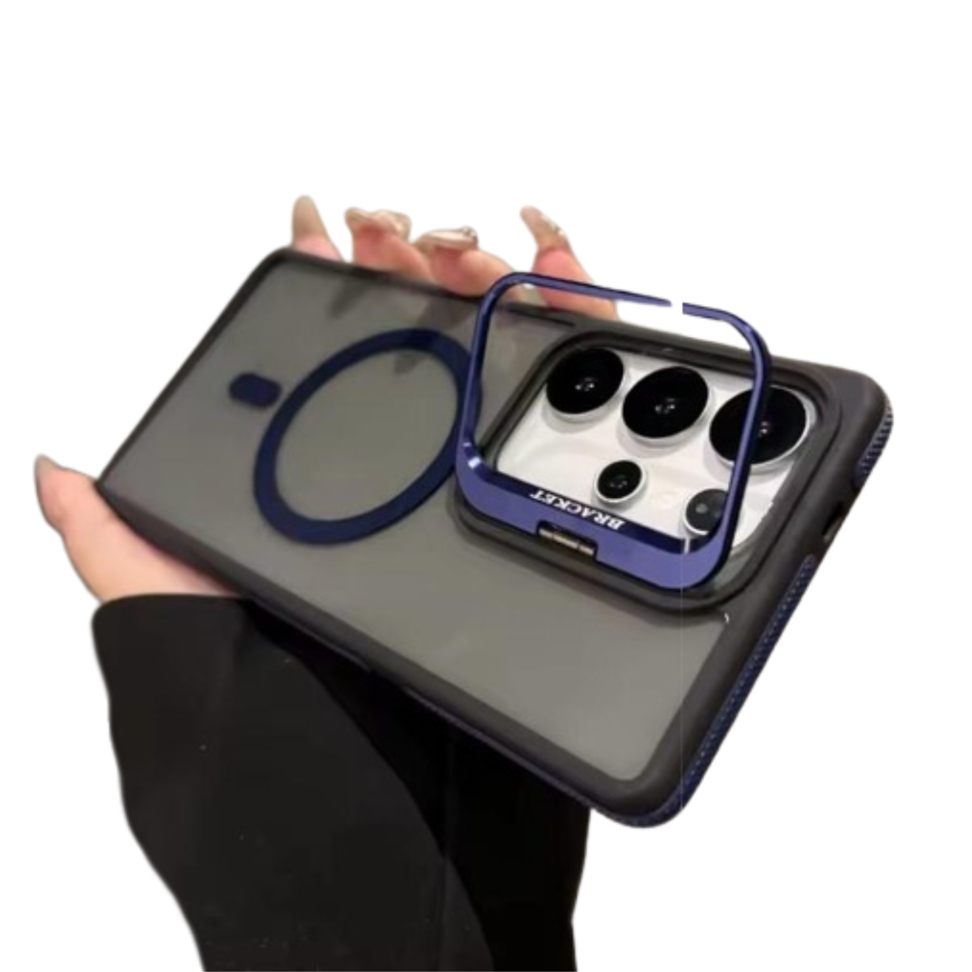 CASE NEGRO ANTISHOCK MATE CON DISEÑO LISO, BORDES REFORZADOS COLOR NEGRO, Y BORDE DE CÁMARA ESTILO SOPORTE AZUL. CONTIENE ARO MAGNÉTICO COMPATIBLE CON CARGA INALÁMBRICA. MODELO ANTISHOCK, PROTECCIÓN ANTI CAIDA. COMPATIBLE CON MODELOS IPHONE.