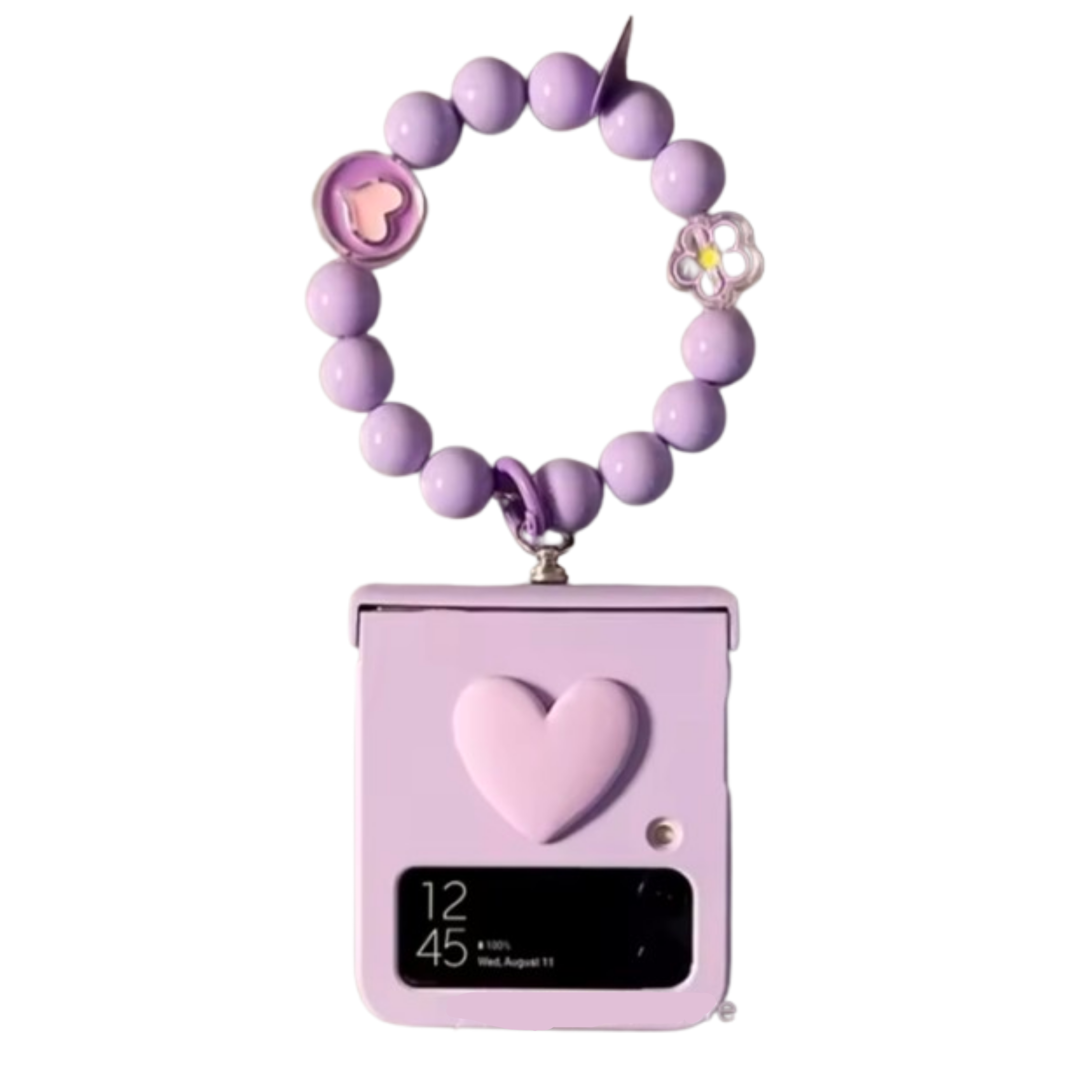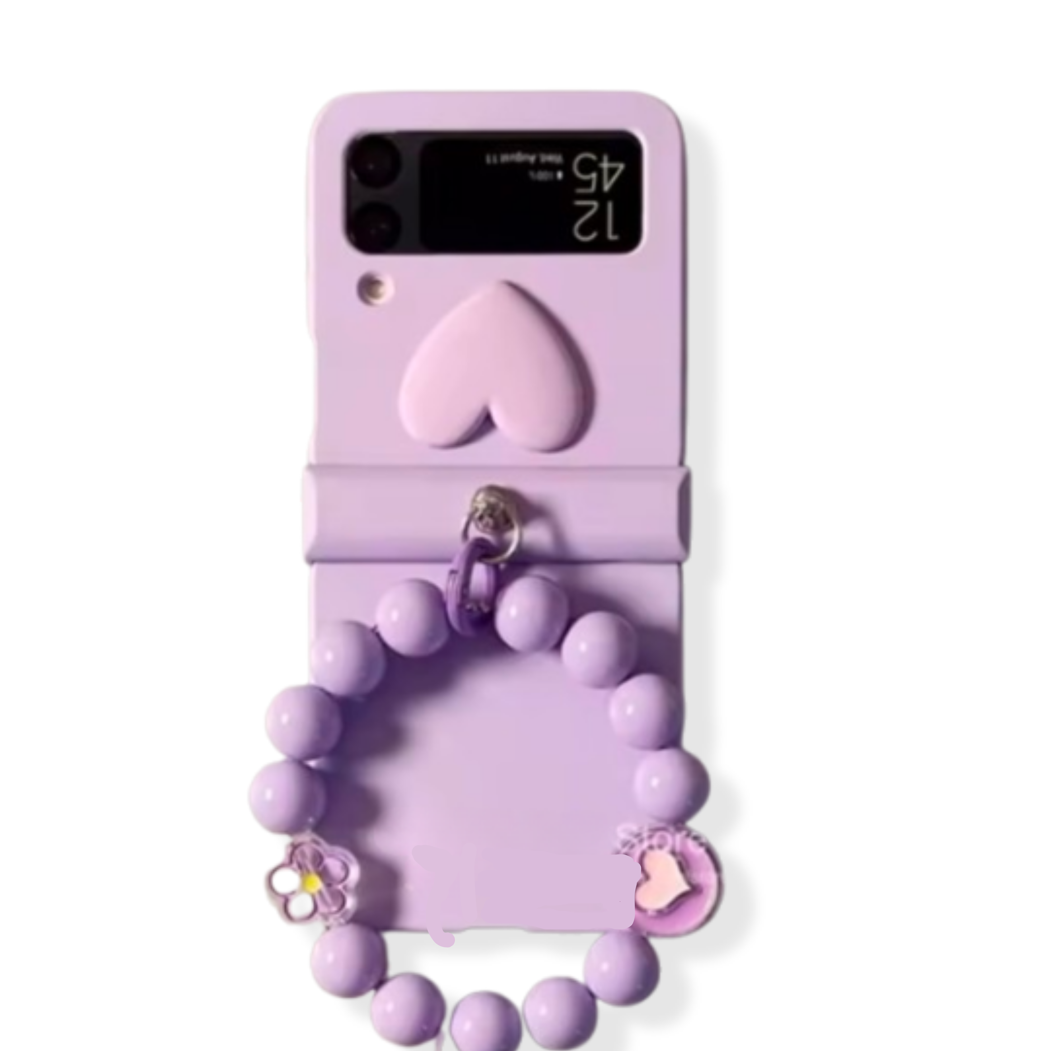 CASE PARA FLIP LILA CON CORAZÓN LILA Y STRAP PREMIUM LILA ESTILO PULSERA. COMPATIBLE CON MODELOS GALAXY Z FLIP SERIES.