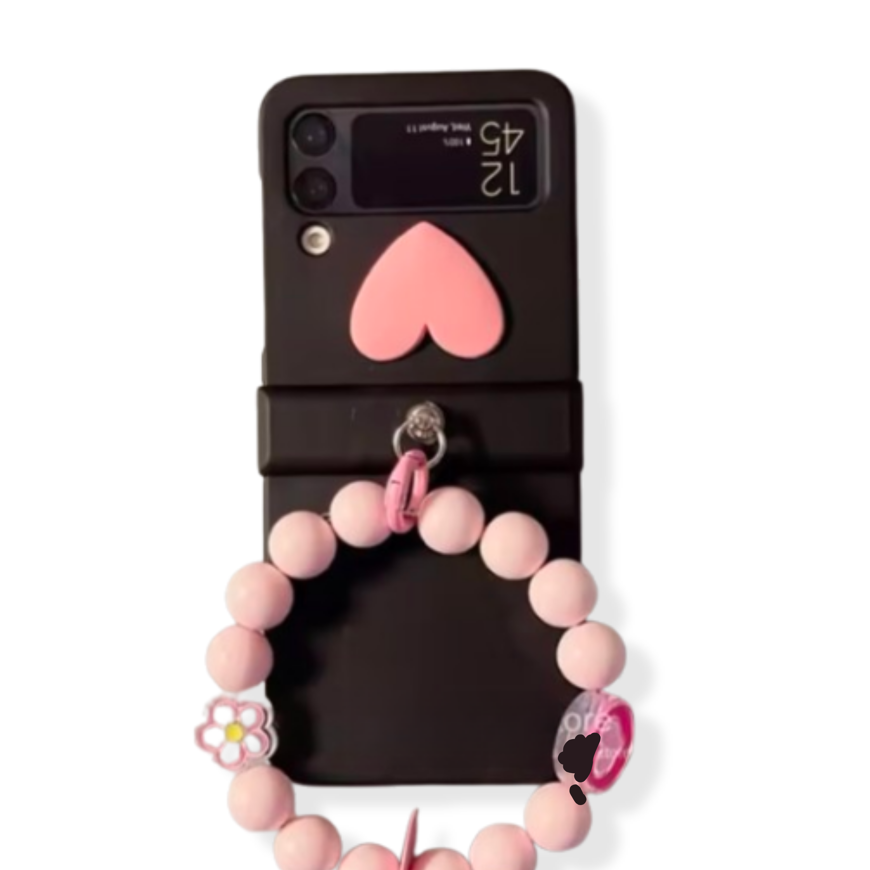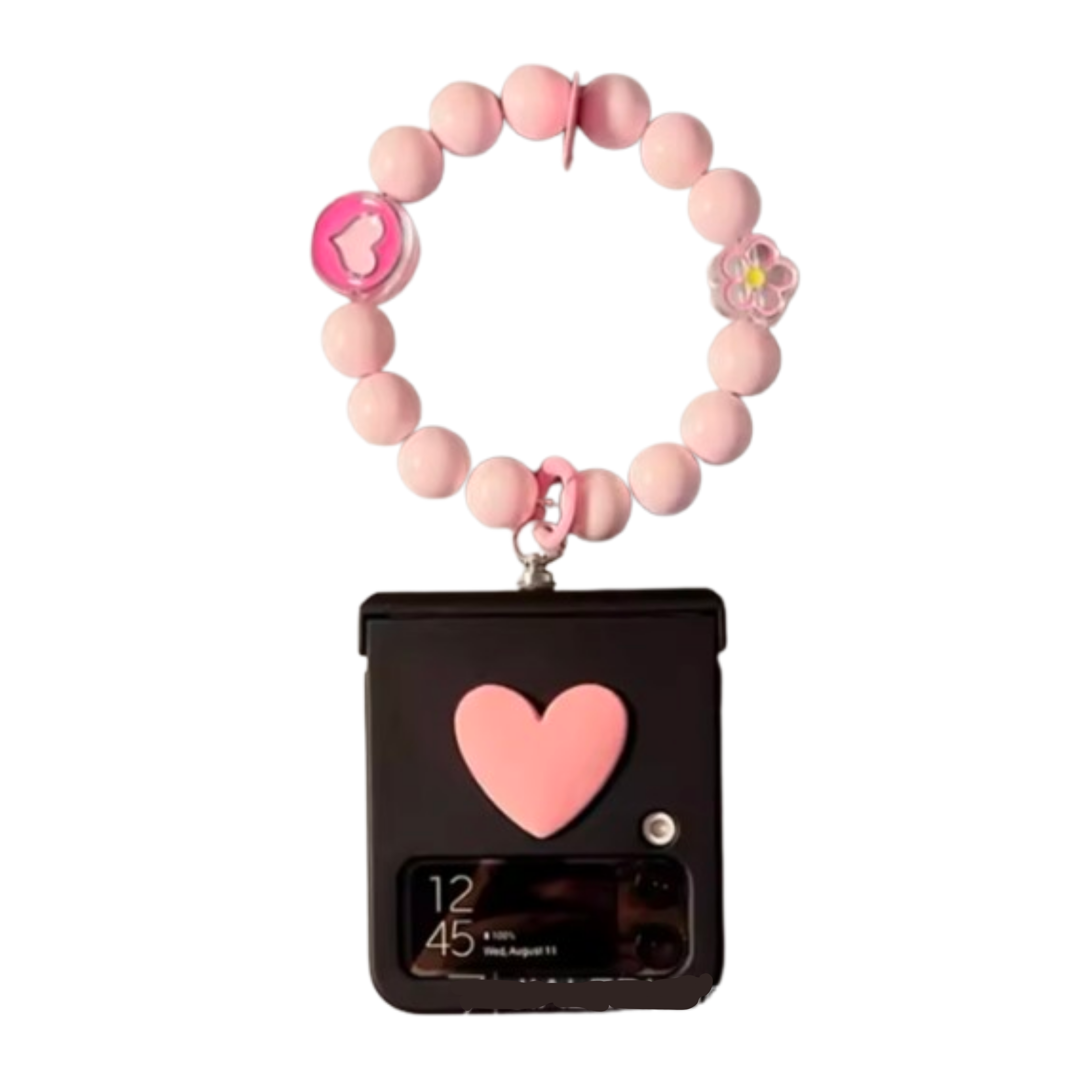 CASE PARA FLIP NEGRO CON CORAZÓN ROASDO Y STRAP PREMIUM ROSADO ESTILO PULSERA. COMPATIBLE CON MODELOS GALAXY Z FLIP SERIES.