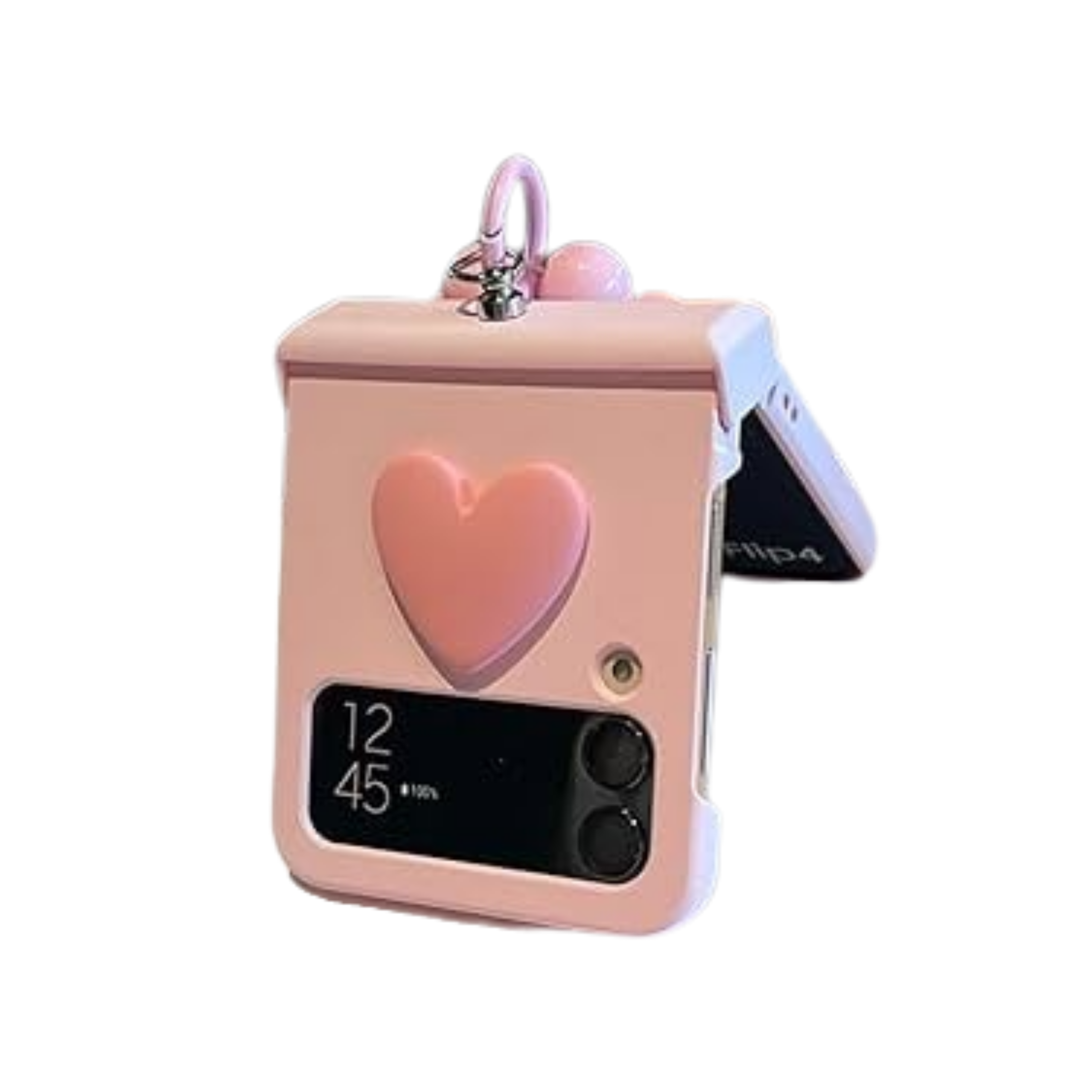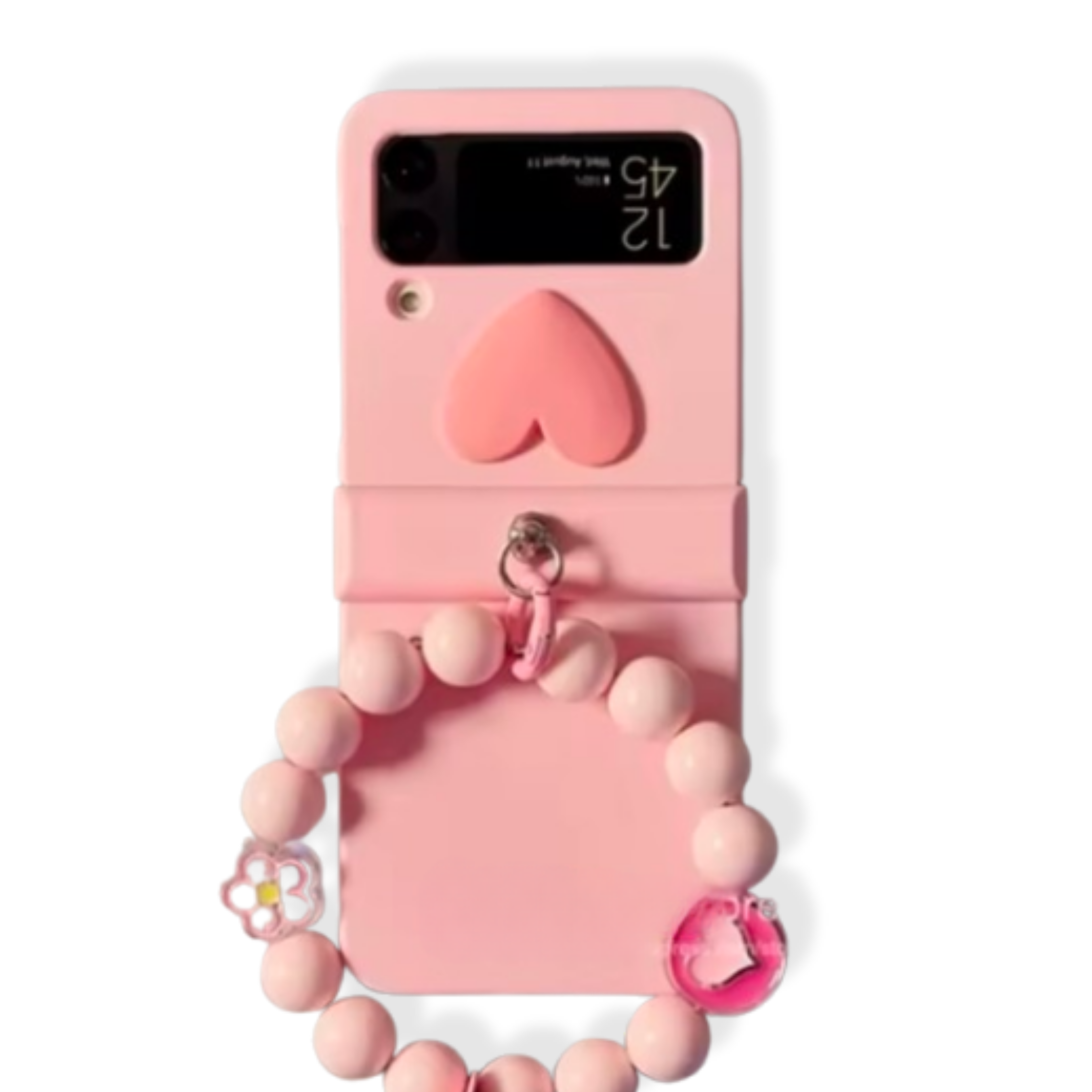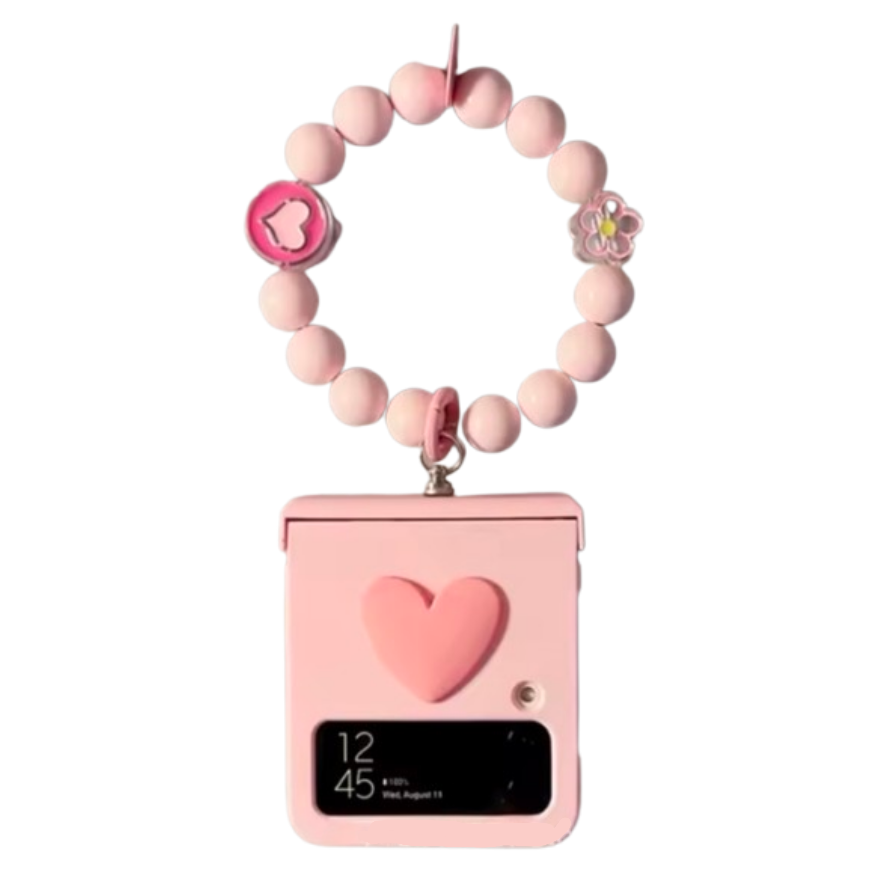 CASE PARA FLIP ROSADO CON CORAZÓN ROSADO EN RELIEVE Y STRAP PREMIUM ROSADO ESTILO PULSERA. COMPATIBLE CON MODELOS GALAXY Z FLIP SERIES.