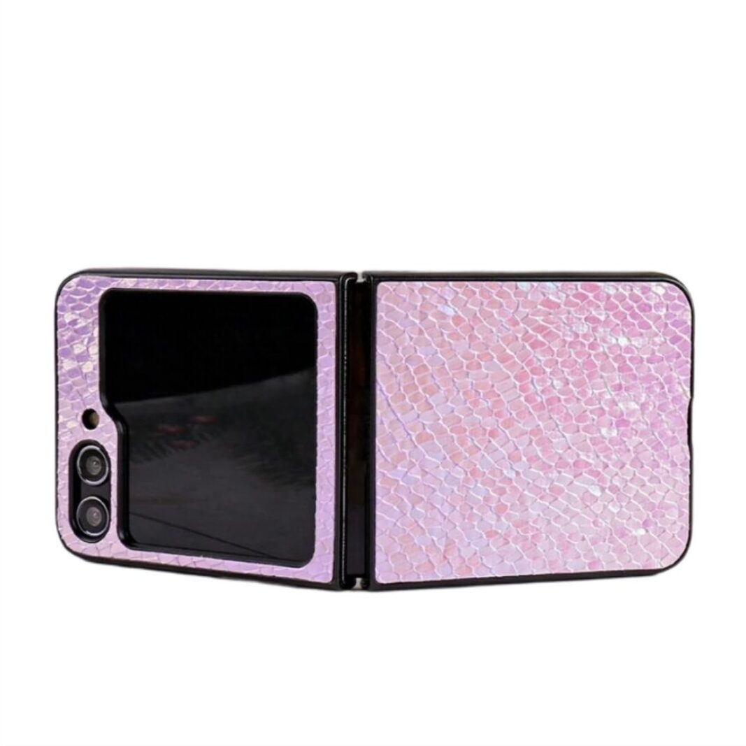 CASE PARA FLIP ROSADO CON TEXTURA ESCAMOSA Y BORDES REFORZADOS DE TPU (ABSORCIÓN DE GOLPES). COMPATIBLE PARA GALAXY Z FLIP SERIES.