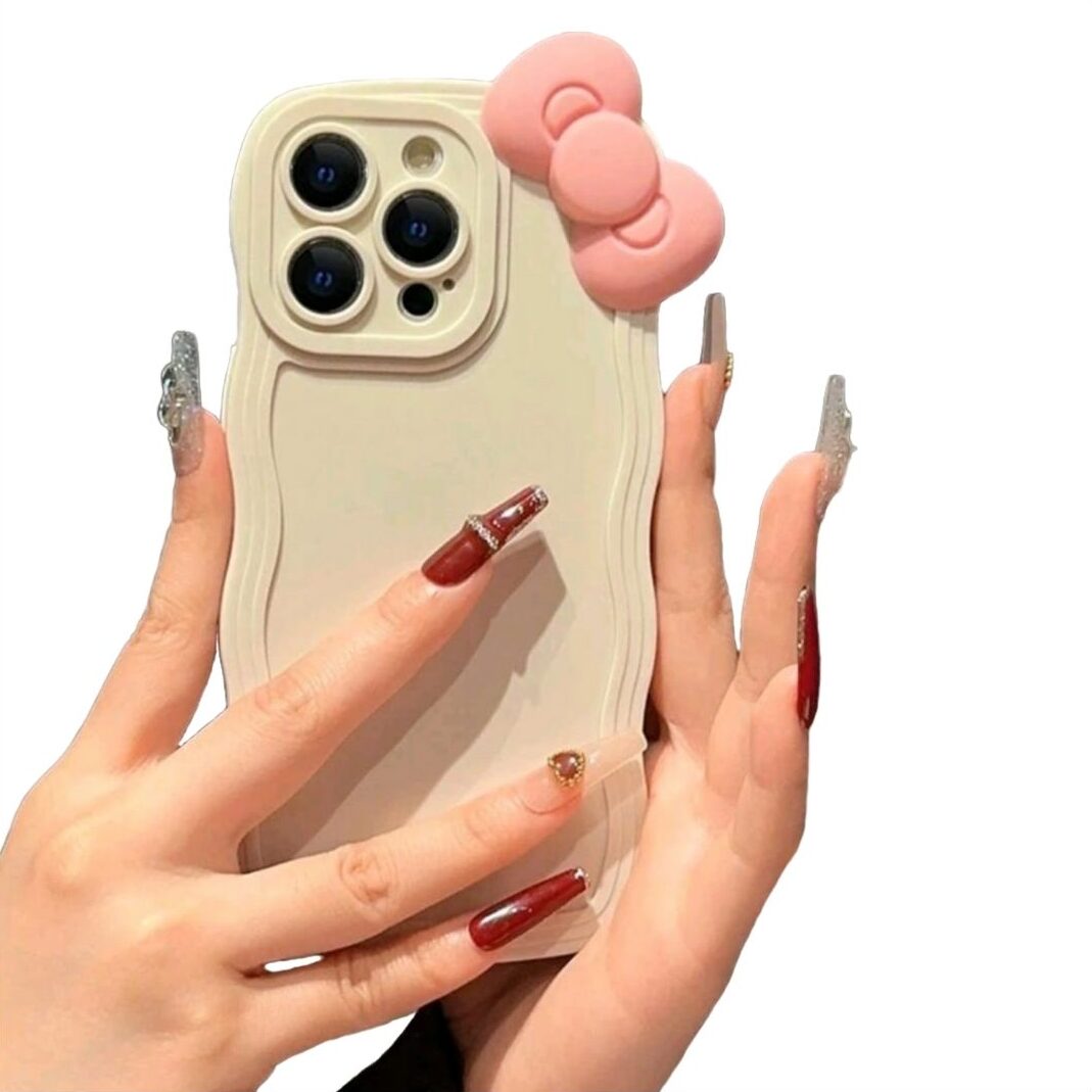 CASE PARA IPHONE CREMA ANTISHOCK, CON BORDES ONDULADOS Y LISTÓN ESTILO HELLO KITTY. COMPATIBLE CON IPHONE.