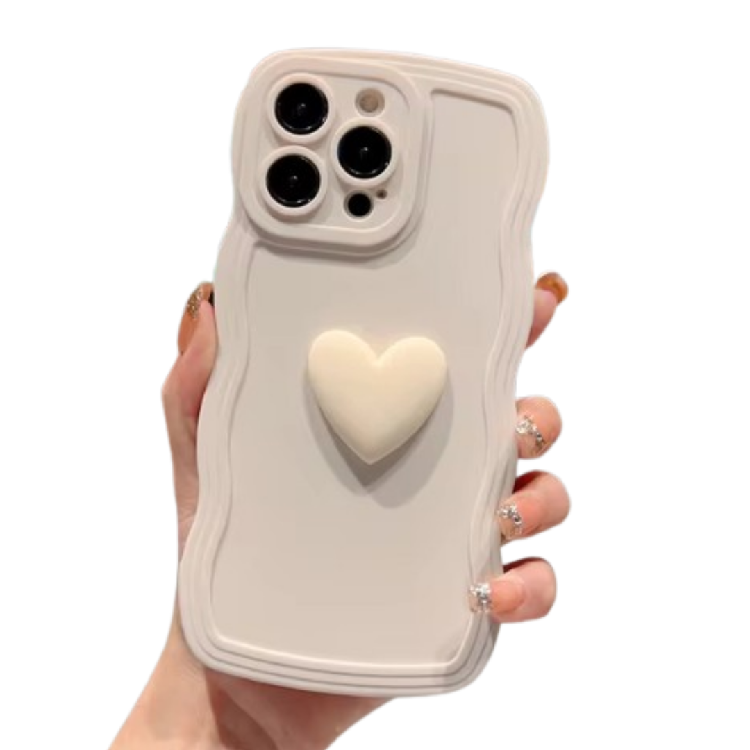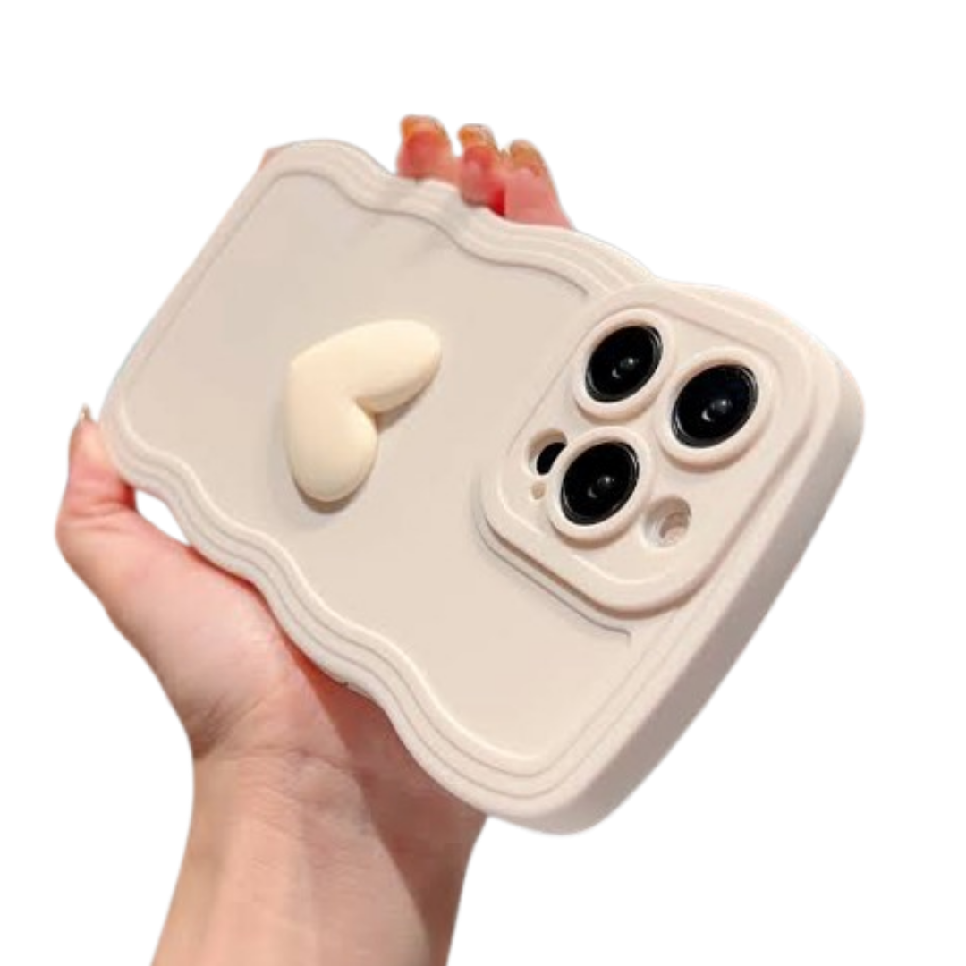 CASE PARA IPHONE CREMA CON CORAZÓN CREMA EN RELIEVE, BORDES ONDULADOS, Y PROTECCIÓN DE BORDE DE CÁMARA. COMPATIBLE CON MODELOS IPHONE.