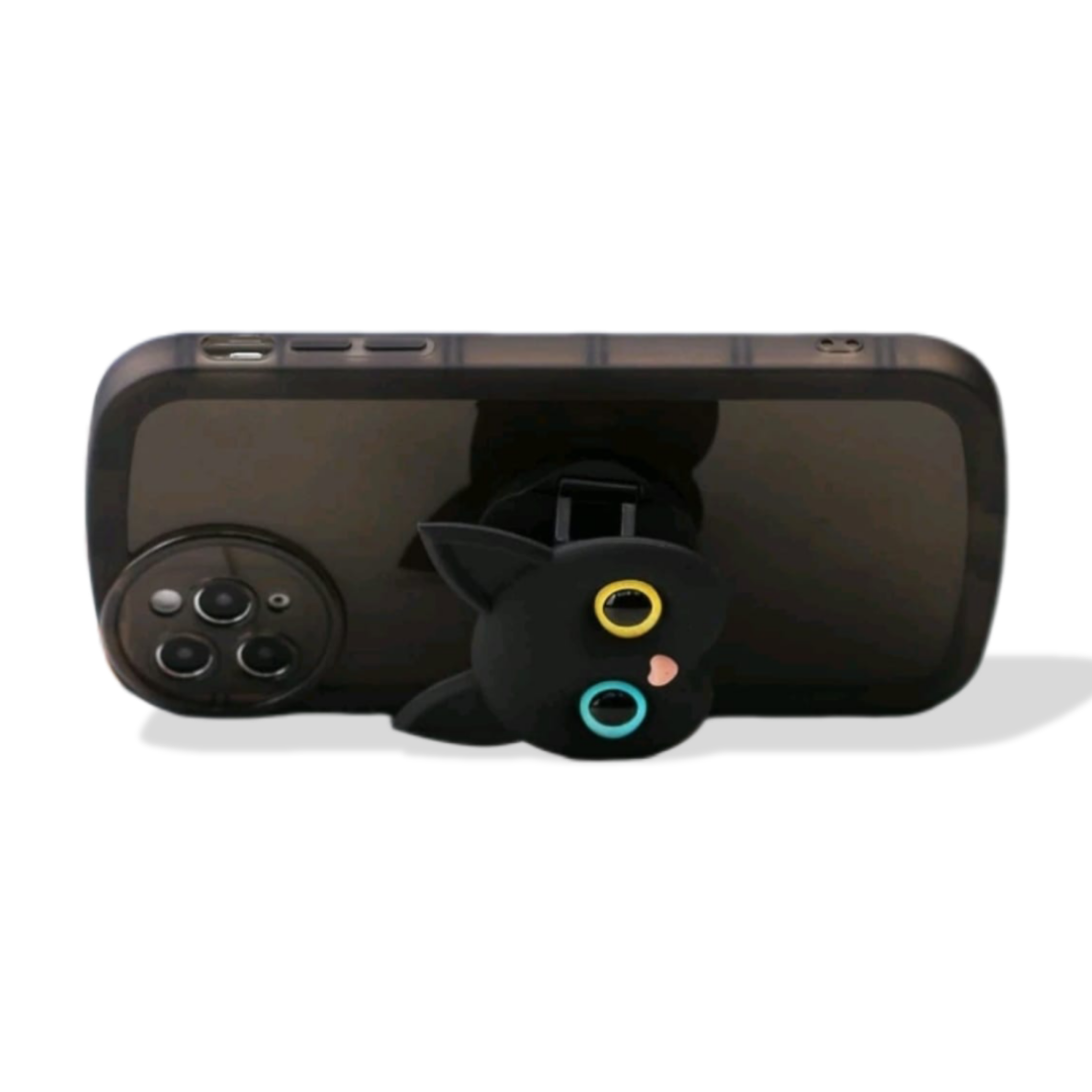 CASE PARA IPHONE NEGRO TRANSPARENTE CON BORDES NEGROS Y POP SOCKET CON DISEÑO DE GATO. COMPATIBLE CON MODELOS IPHONE.