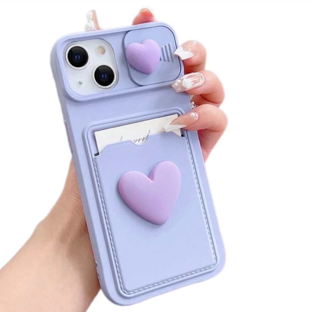 CASE PARA IPHONE LILA DE SILICONA, CON TAPA DESLIZABLE DE CÁMARA, TARJETERO, Y BORDES REFORZADOS. COMPATIBLE CON IPHONE.