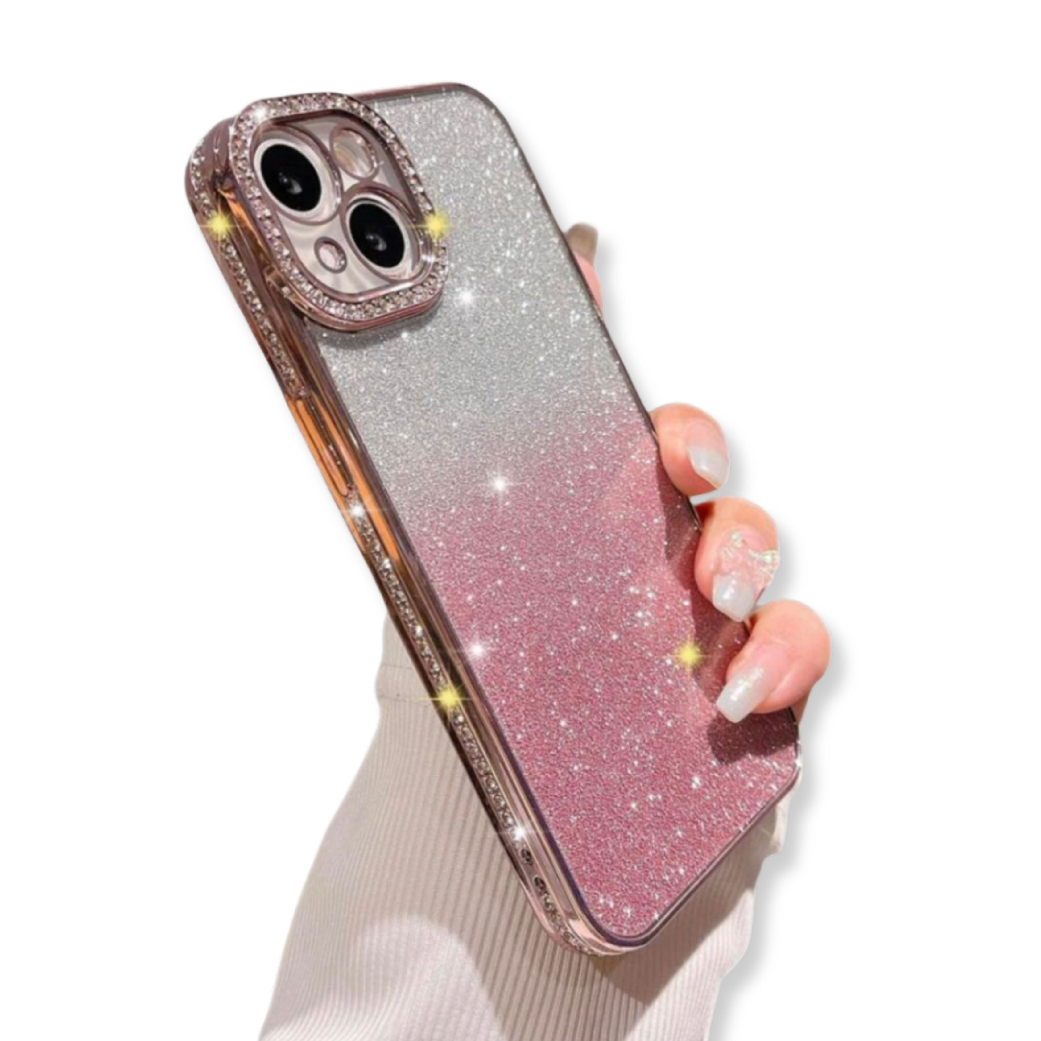 CASE PARA IPHONE PREMIUM COLOR ROSADO DOS TONOS, CON BORDES REFORZADOS, ANTISHOCK, CON GLITTER Y DIAMANTES DE IMITACIÓN, COMPATIBLE CON IPHONE.