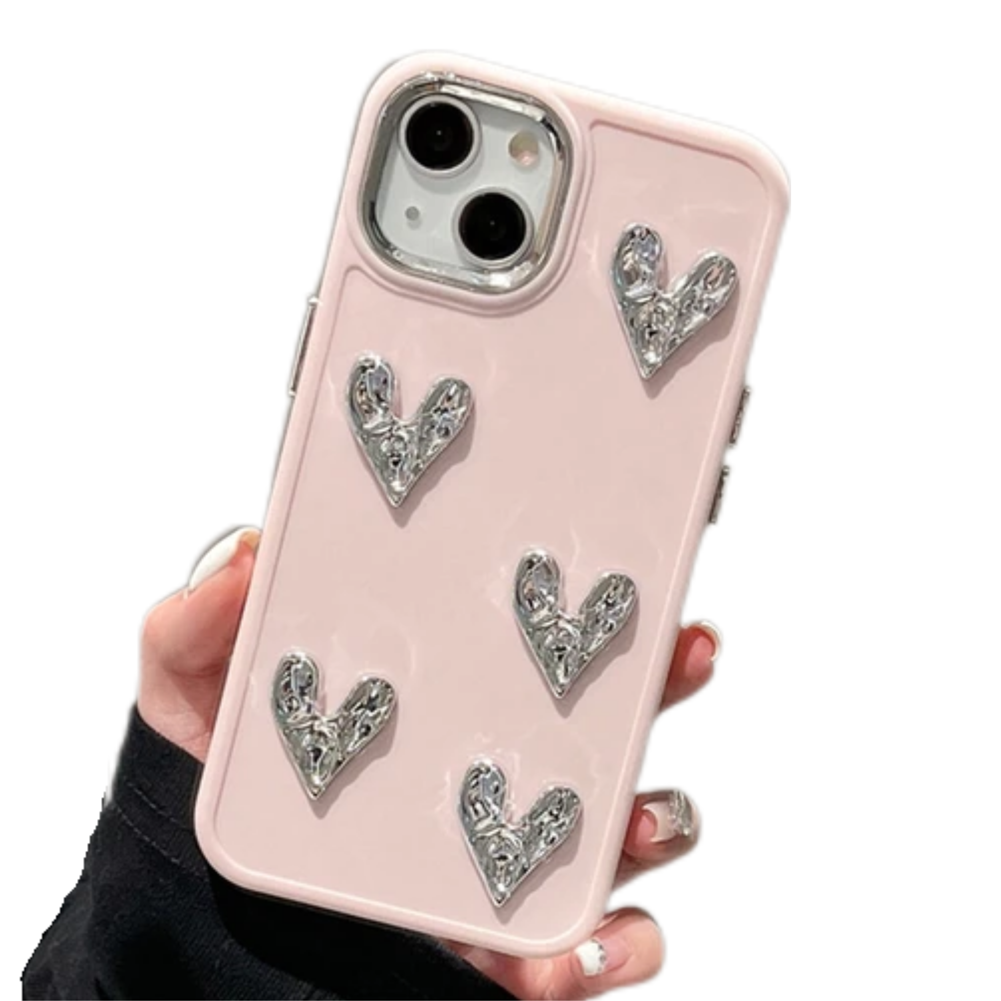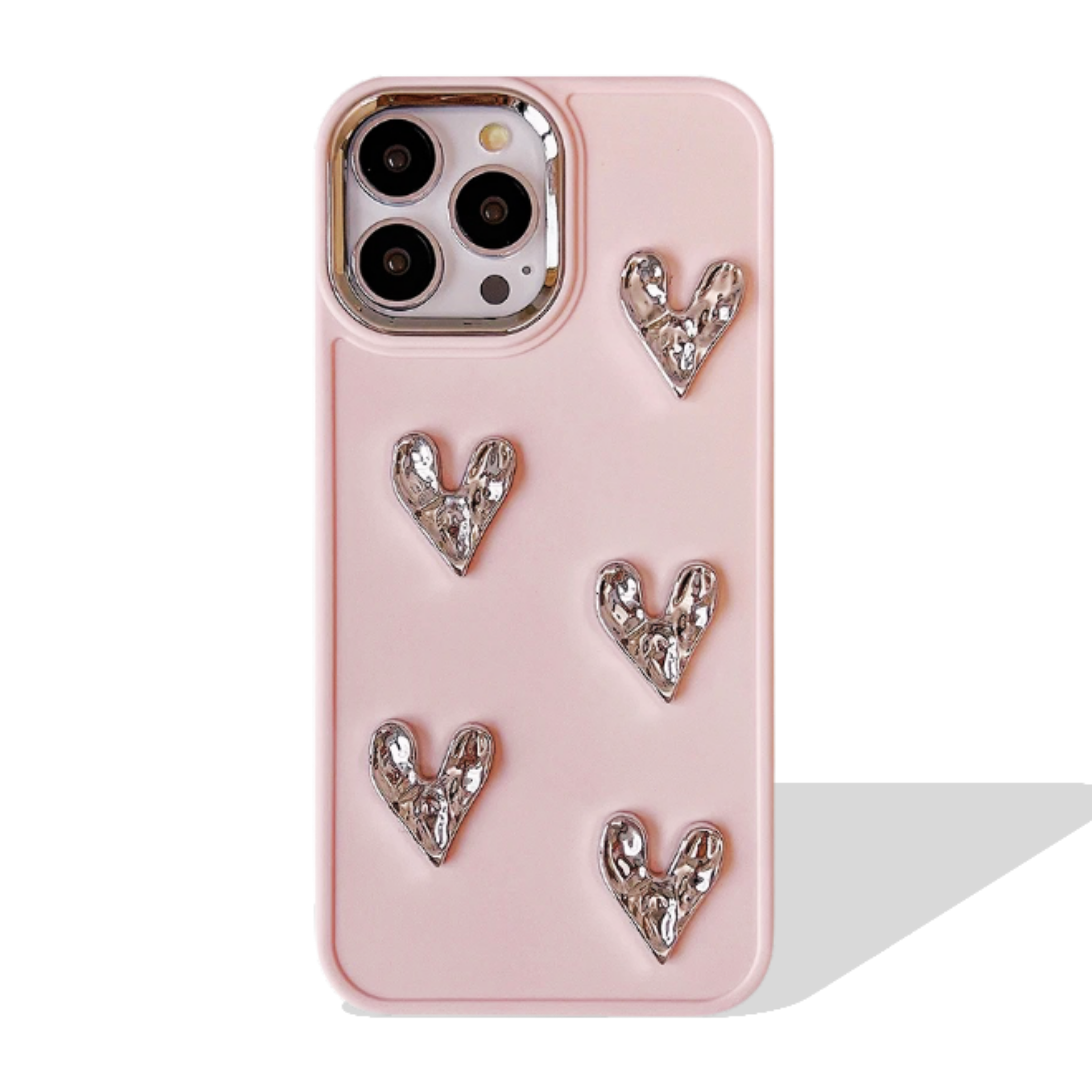 CASE PARA IPHONE ROSADO COLOR ENTERO CON DISEÑO DE CORAZONES PLATEADOS EN RELIEVE Y BORDES REFORZADOS. COMPATIBLE CON IPHONE.