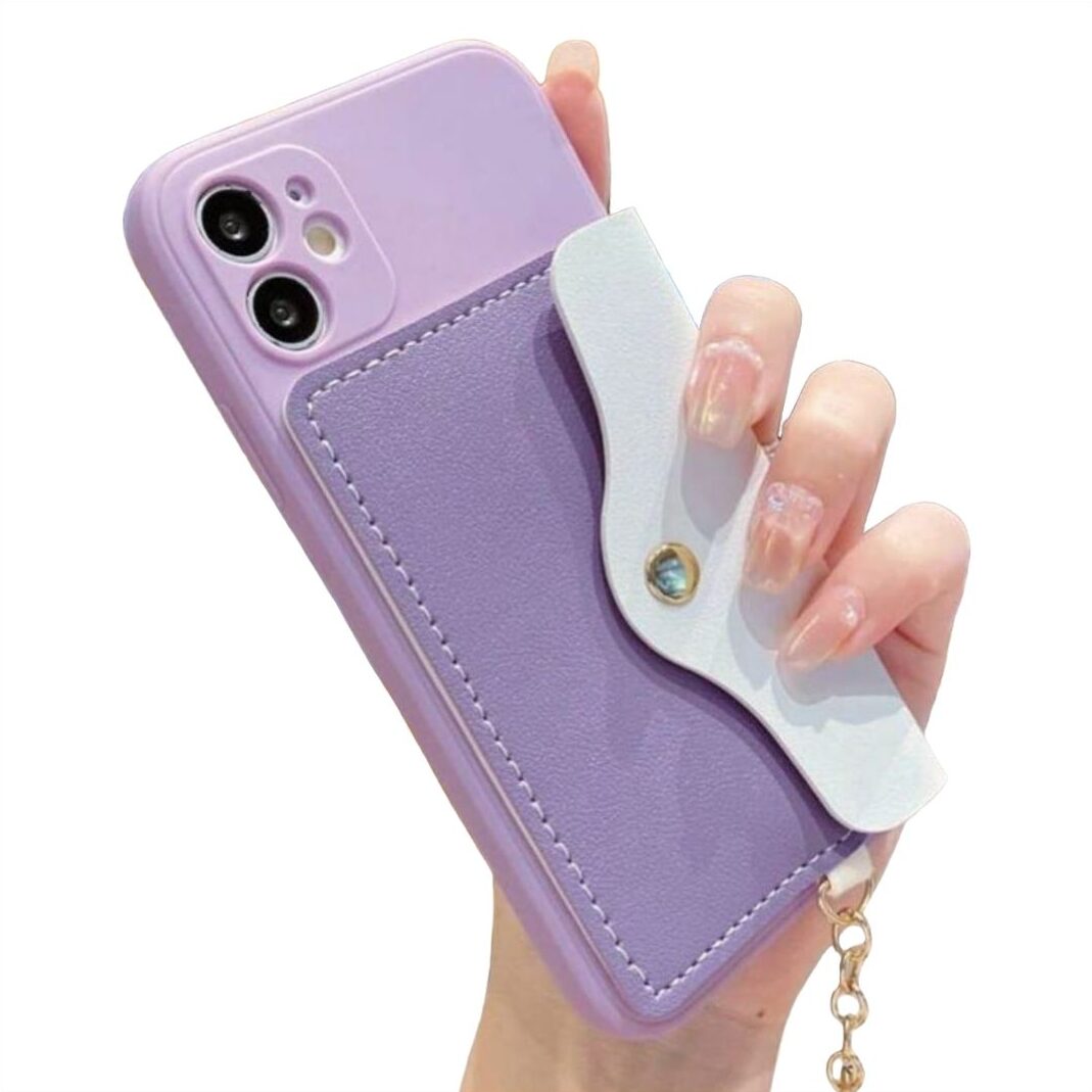 CASE PARA IPHONE Y SAMSUNG COLOR LILA CON MONEDERO/TARJETERO, ADORNO DE LLAVERO DORADO, Y PROTECCIÓN DE CÁMARA.