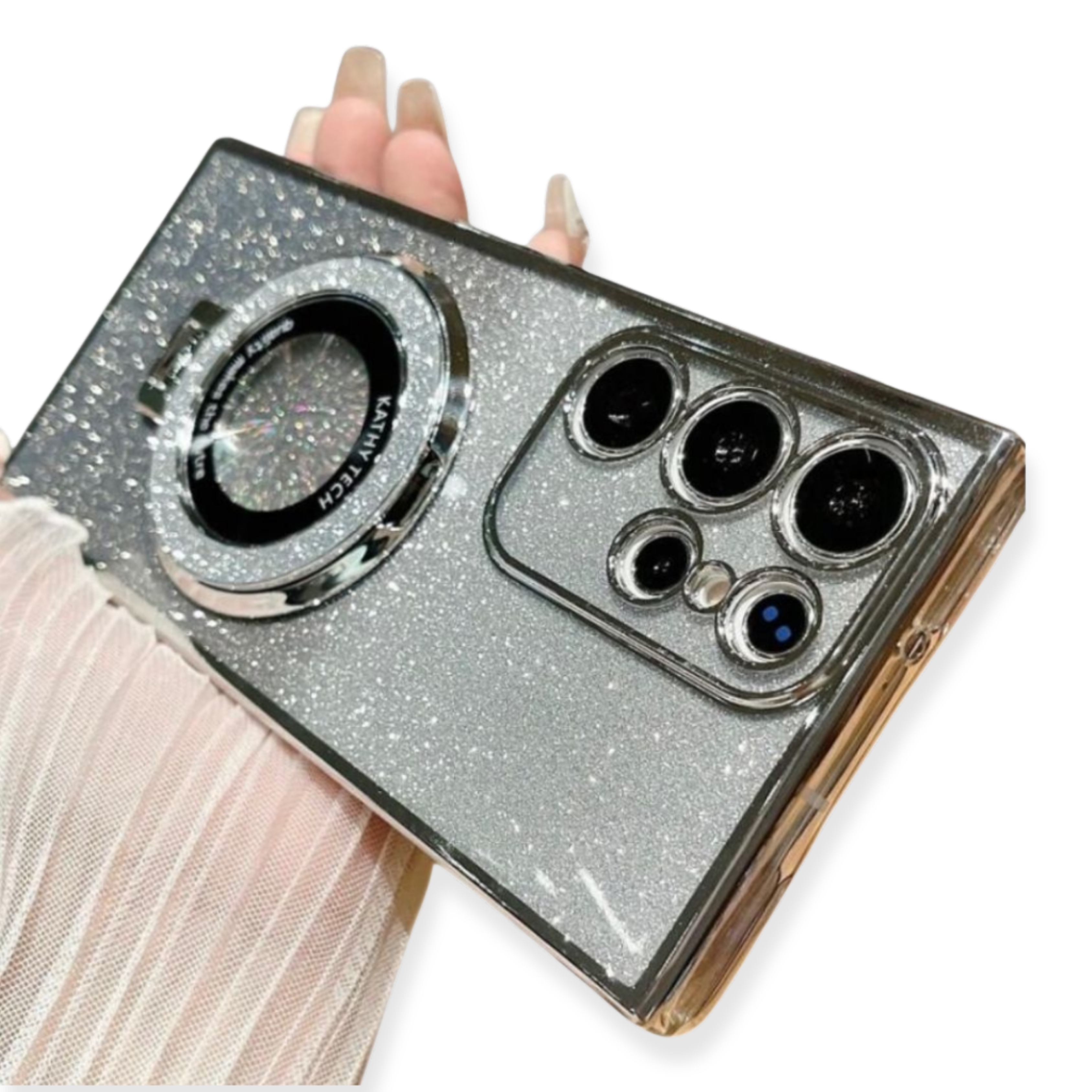 CASE PARA IPHONE Y SAMSUNG ANTISHOCK PLATEADO CON DISEÑO BRILLANTE (GLITTER), CON BORDES REFORZADOS (PROTECCIÓN ANTI CAÍDA) Y ANILLO PARA SOPORTE.