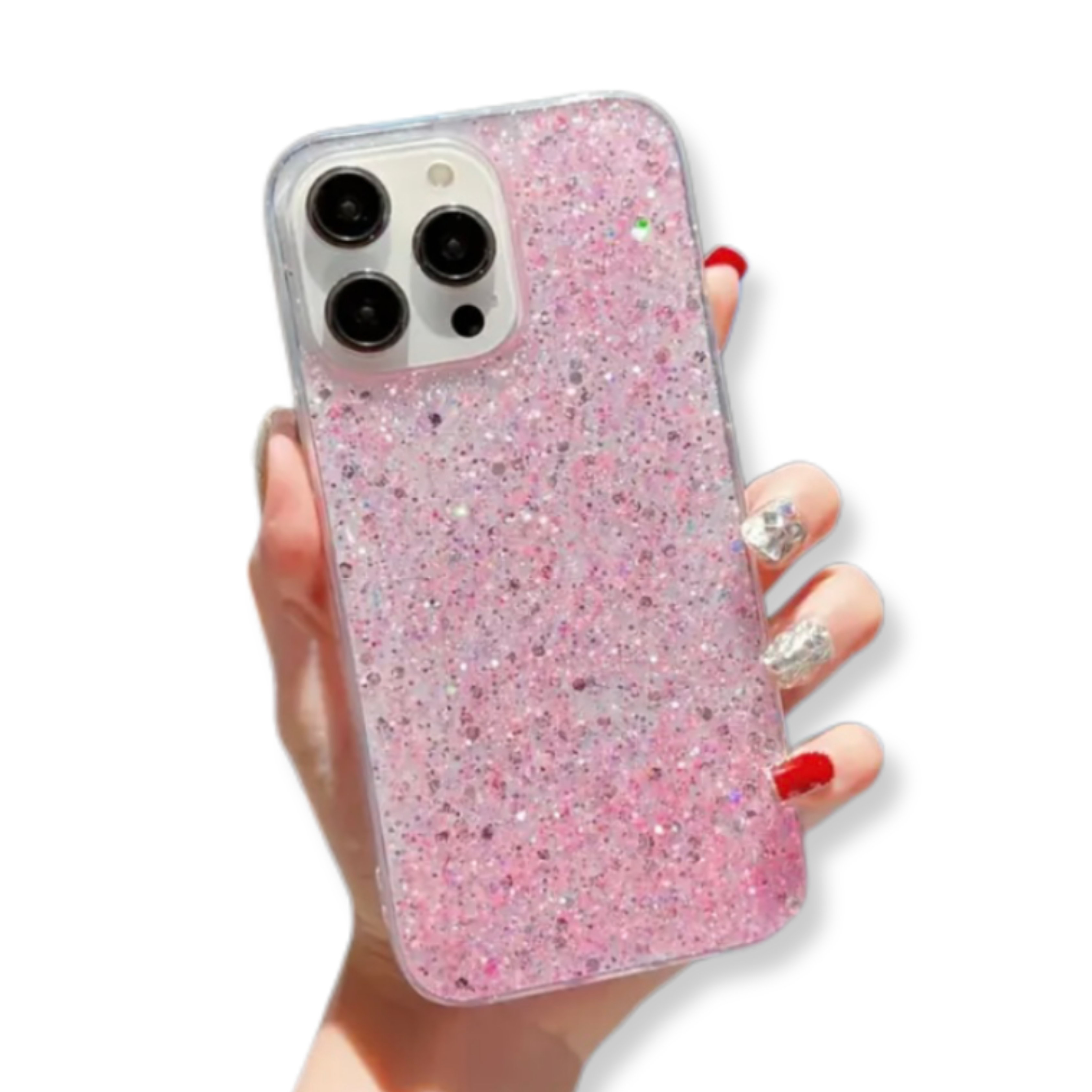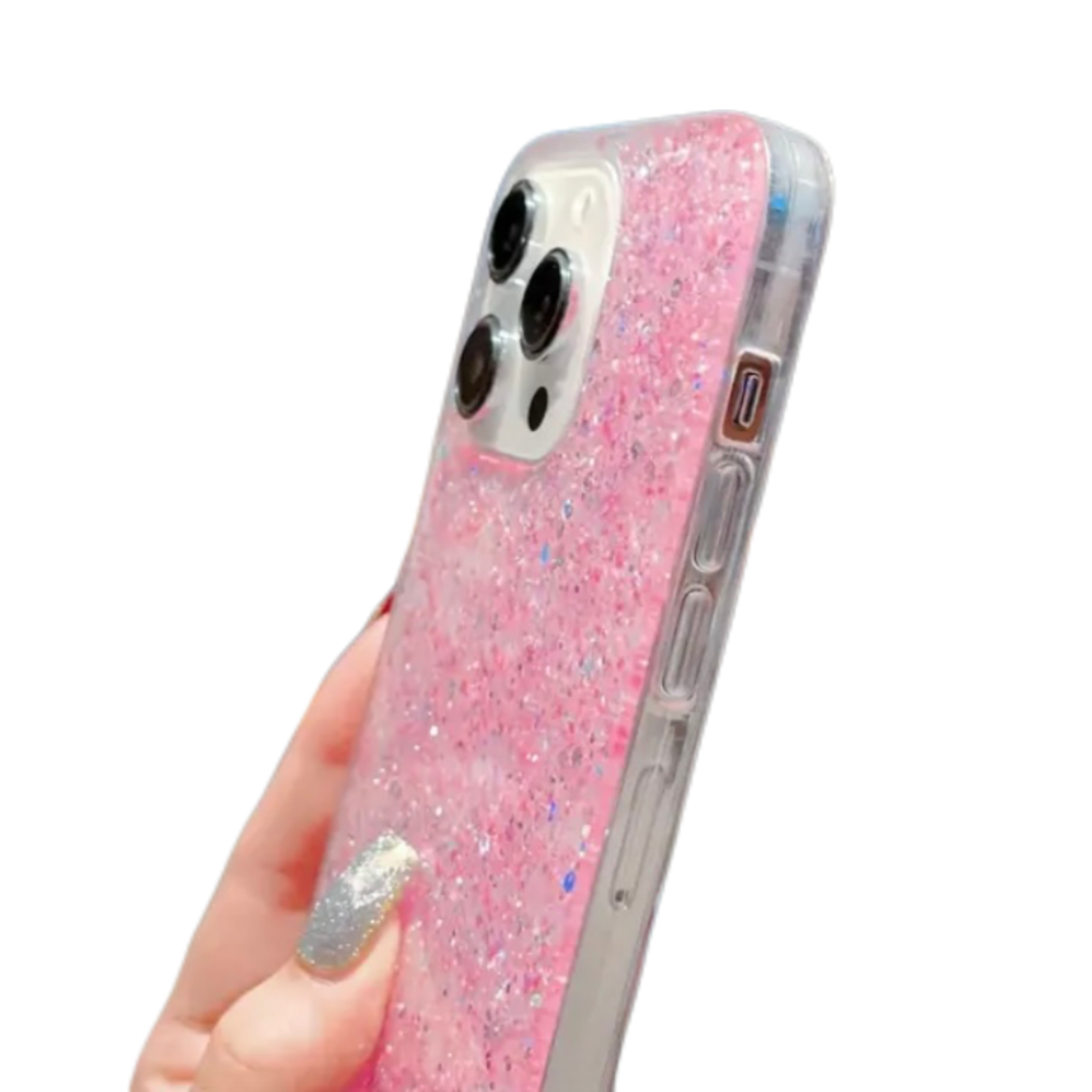 CASE PARA SAMSUNG TRANSPARENTE CON LENTEJUELAS BRILLANTES COLOR ROSADO Y SUPERFICIE DE SILICONA. COMPATIBLE CON SAMSUNG.