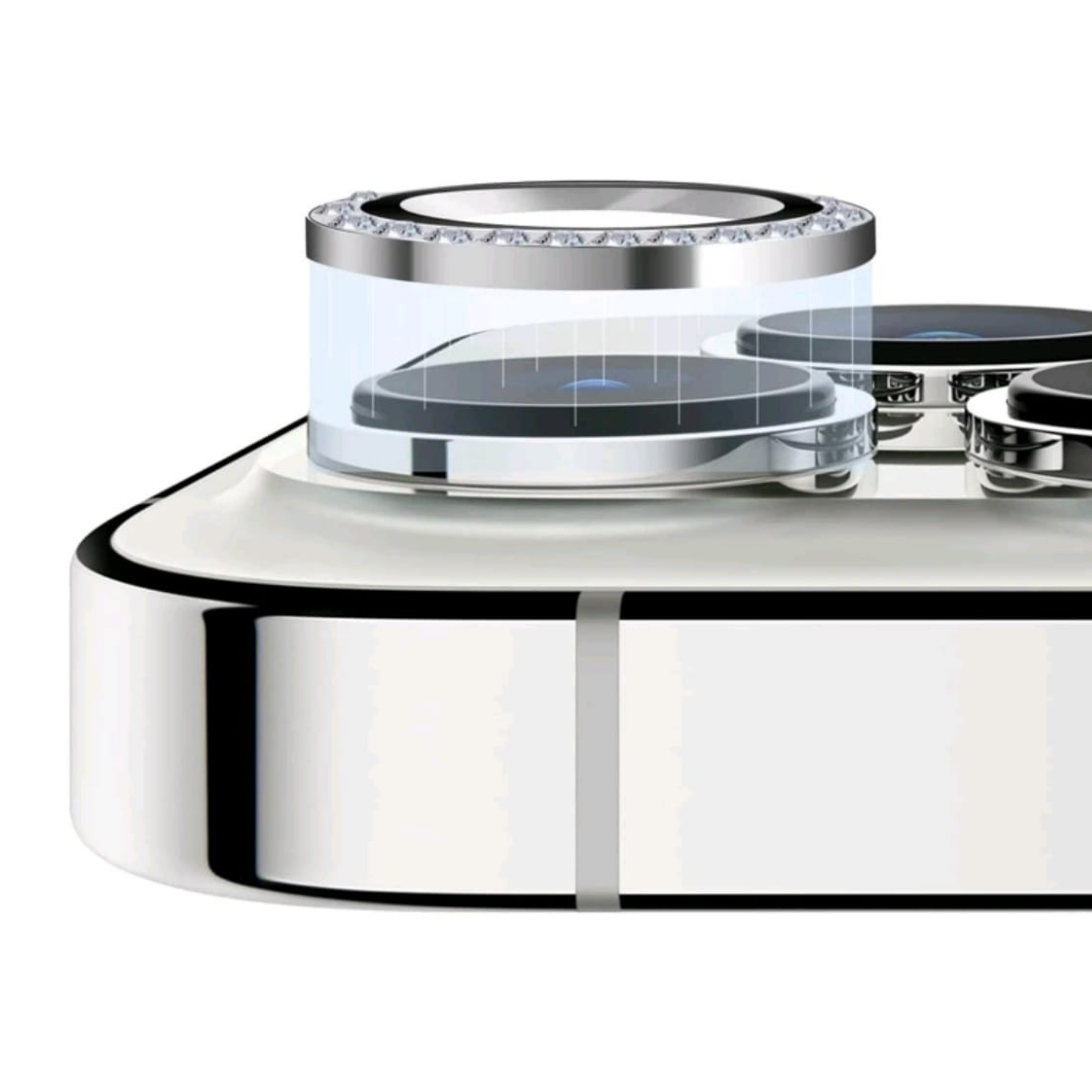 PROTECTOR DE CÁMARA PARA IPHONE CON DECORACIÓN DE DIAMANTES DE IMITACIÓN CON INCRUSTACIONES Y BORDES DE COLOR PLATEADO, RESISTENTE A GOLPES Y RAYADURAS.