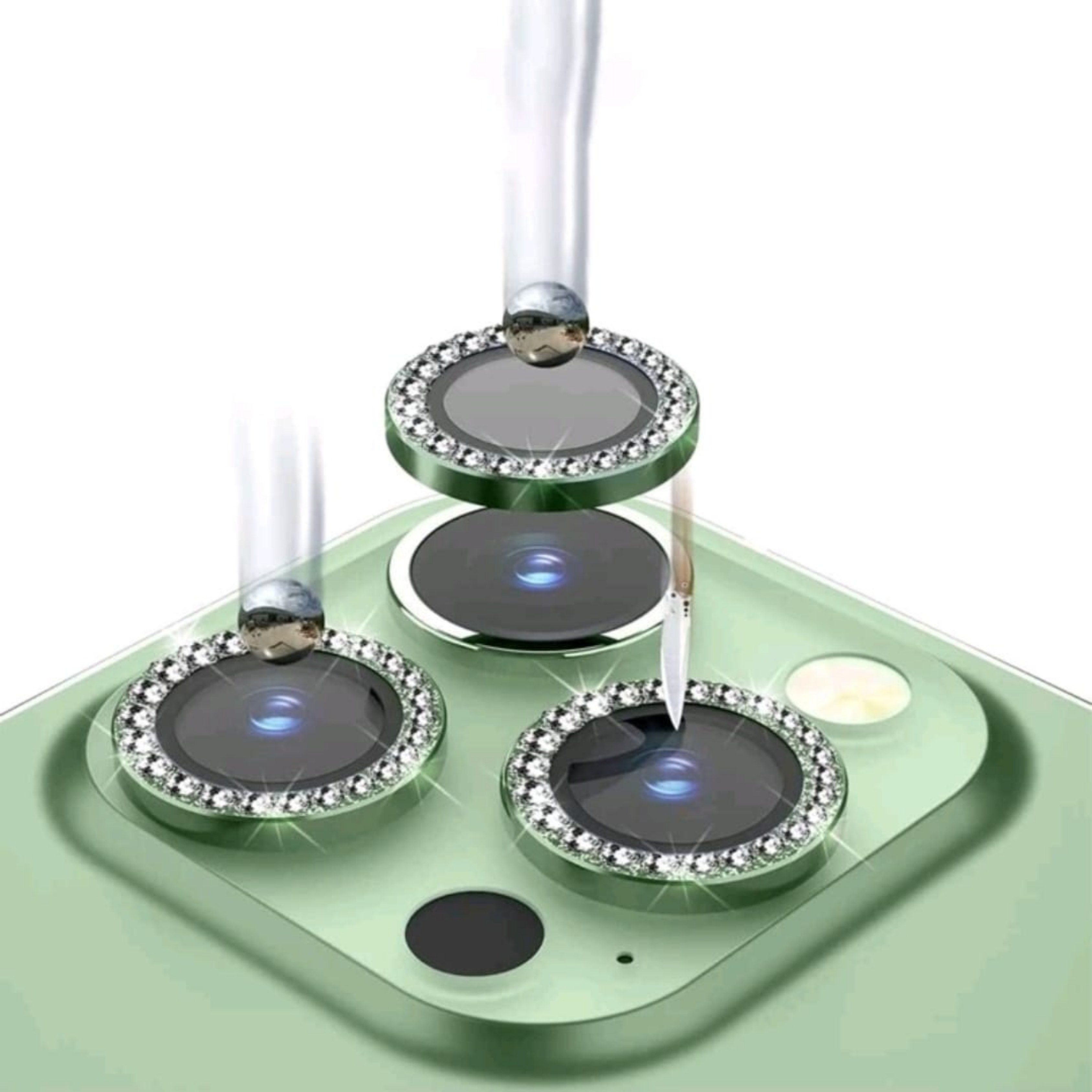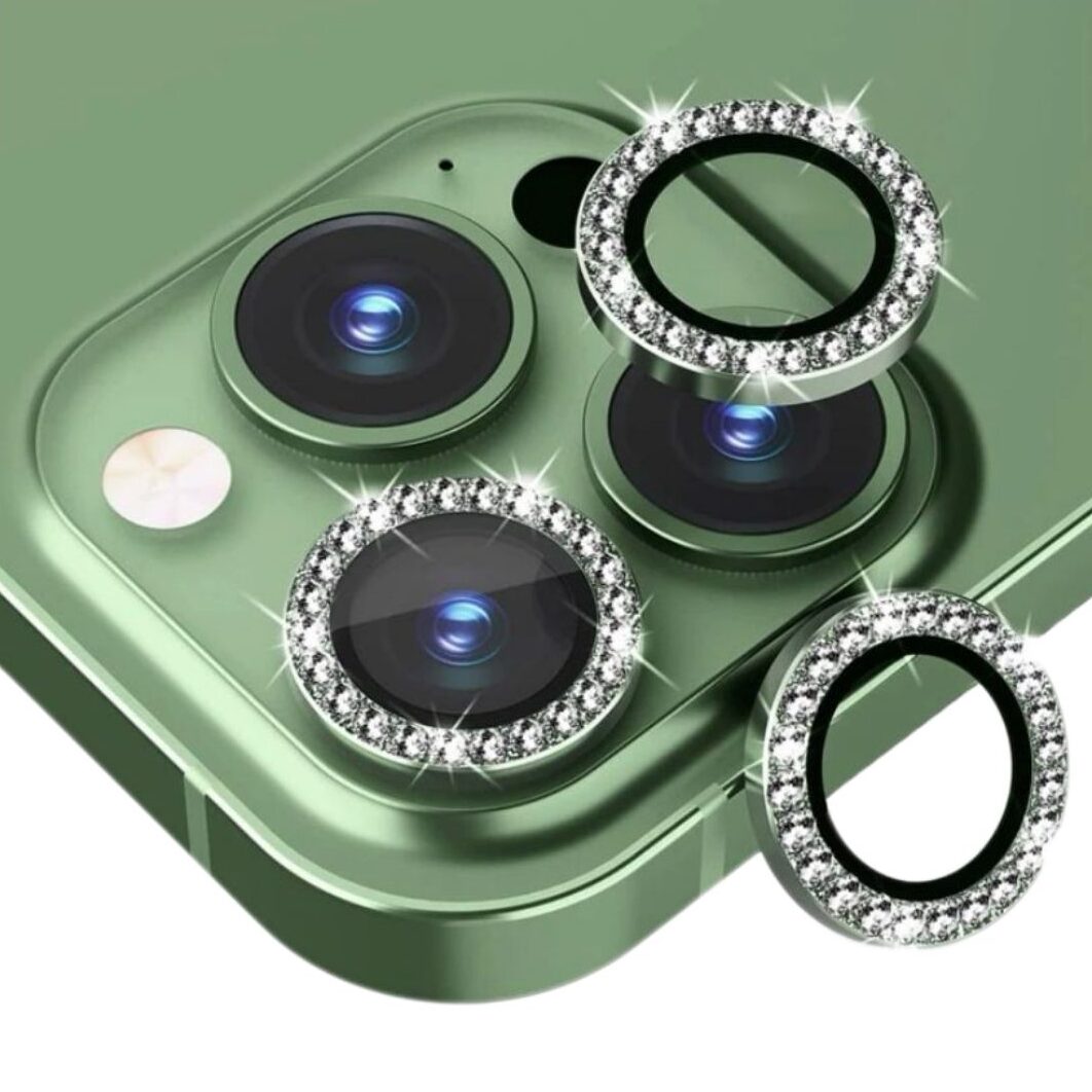 PROTECTOR DE CÁMARA PARA IPHONE CON DECORACIÓN DE PEDRERÍA BRILLANTE Y BORDES DE COLOR VERDE, RESISTENTE A GOLPES Y RAYADURAS. COMPATIBLE CON MODELOS IPHONE.